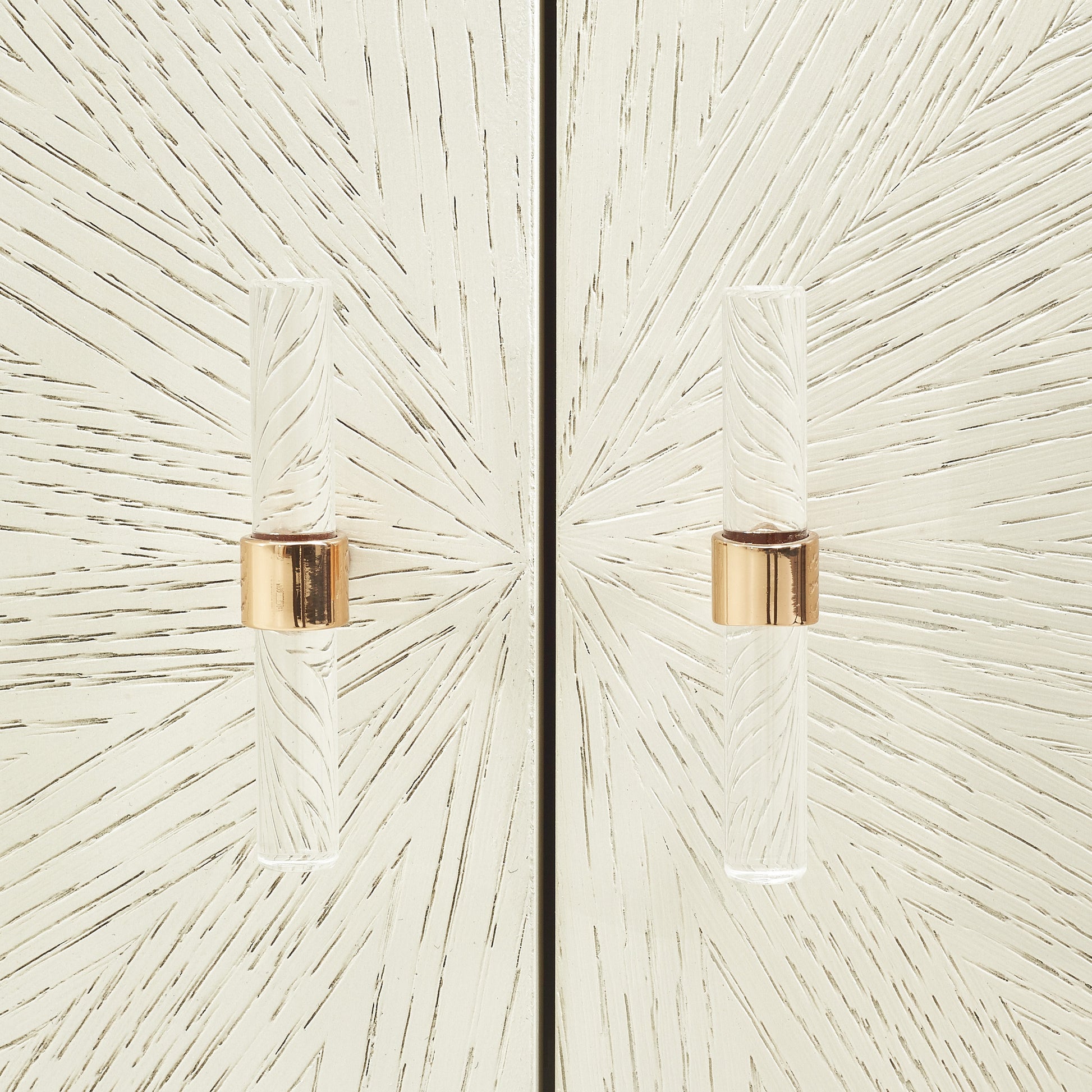 - Sideboard features four cabinet doors with a White Oak veneer pattern and acrylic pulls. Each pair contains a velvet lined drawer and 2 shelving spaces