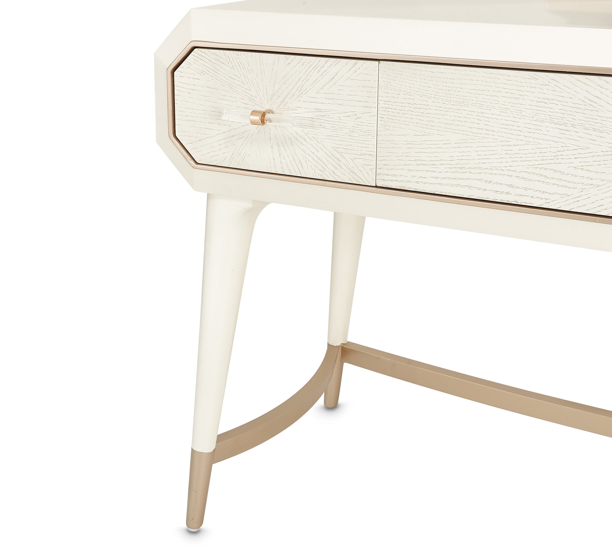 - Vanity contains three velvet lined drawers with self-closing glides and acrylic pulls