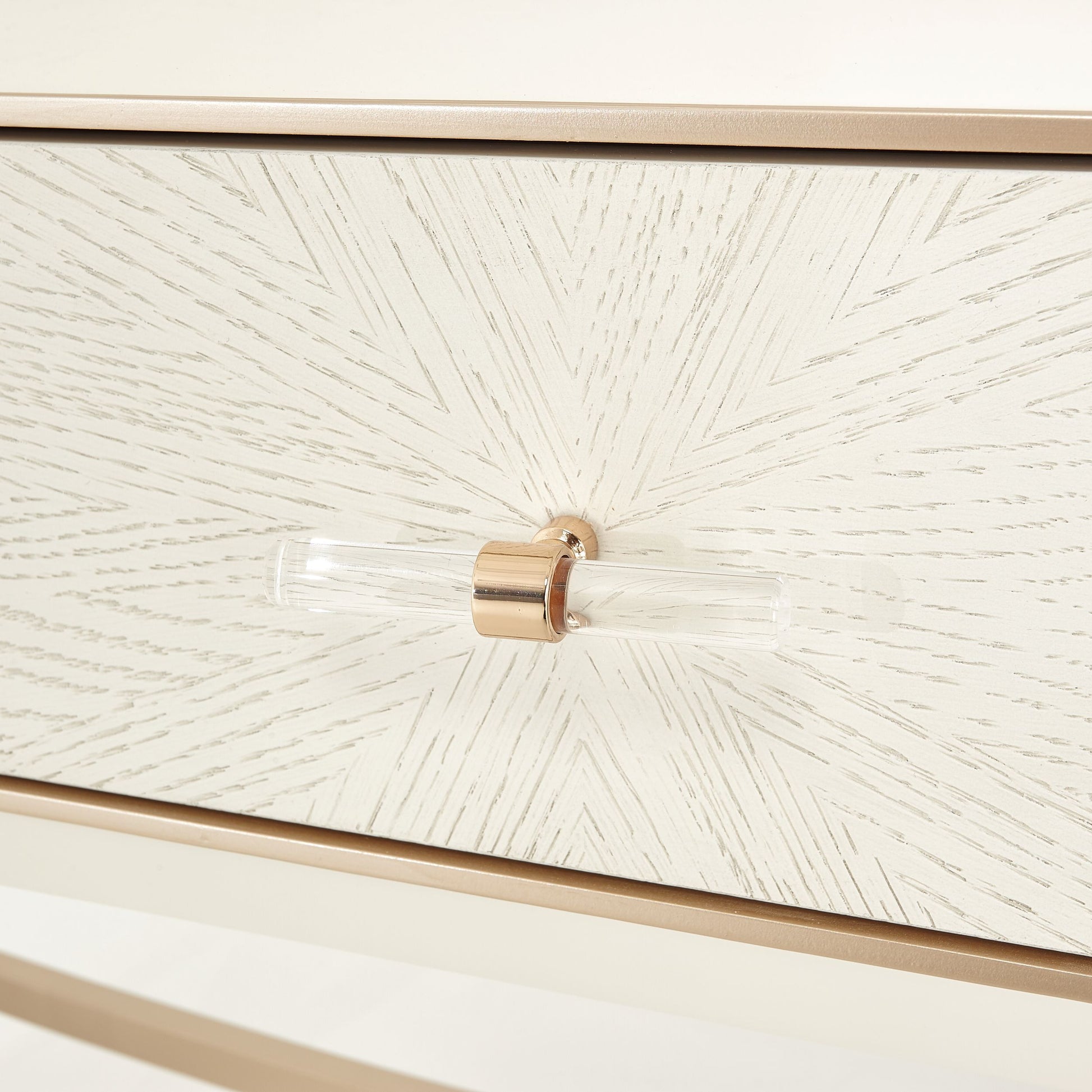 - Drawer fronts feature a White Oak veneer pattern and Chardonnay trim