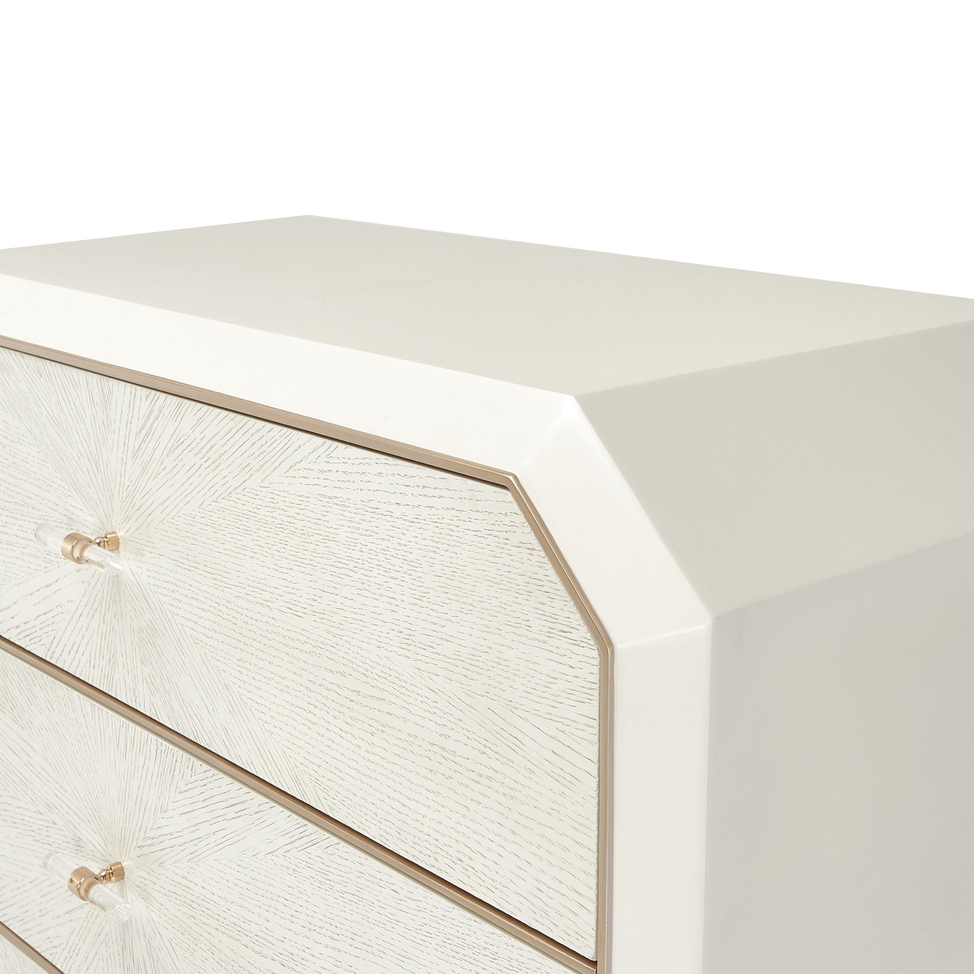 Complete your bedroom look to perfection! The La Rachelle Chest is more than storage, with a stunning starburst veneer pattern and the collection’s signature clipped corners. Top it off with your favorite modern decor, and let your style glow!