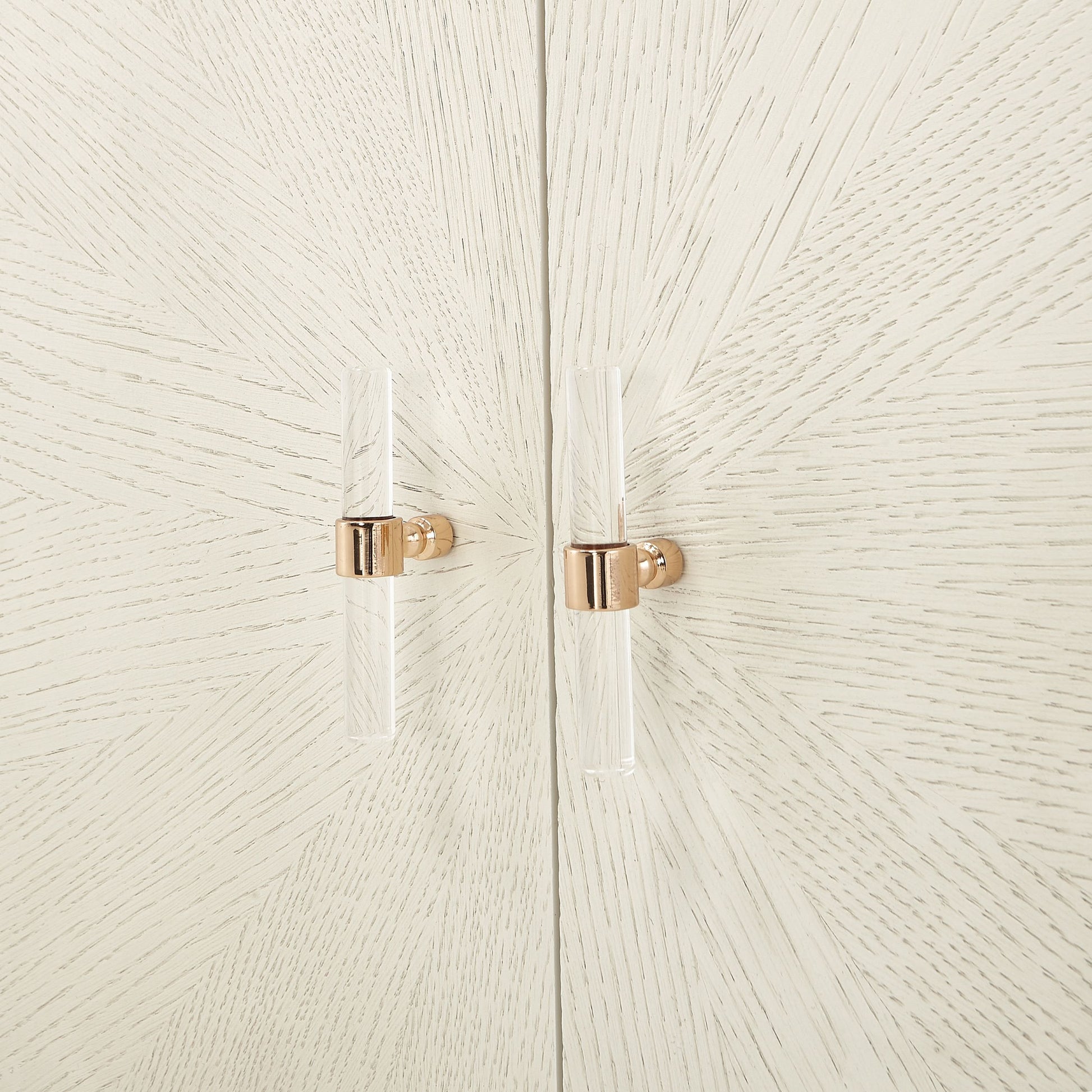 - Side doors feature a white Oak veneer pattern and acrylic pulls
