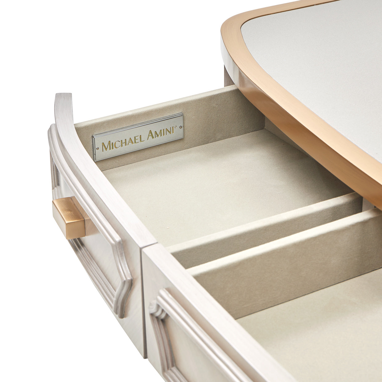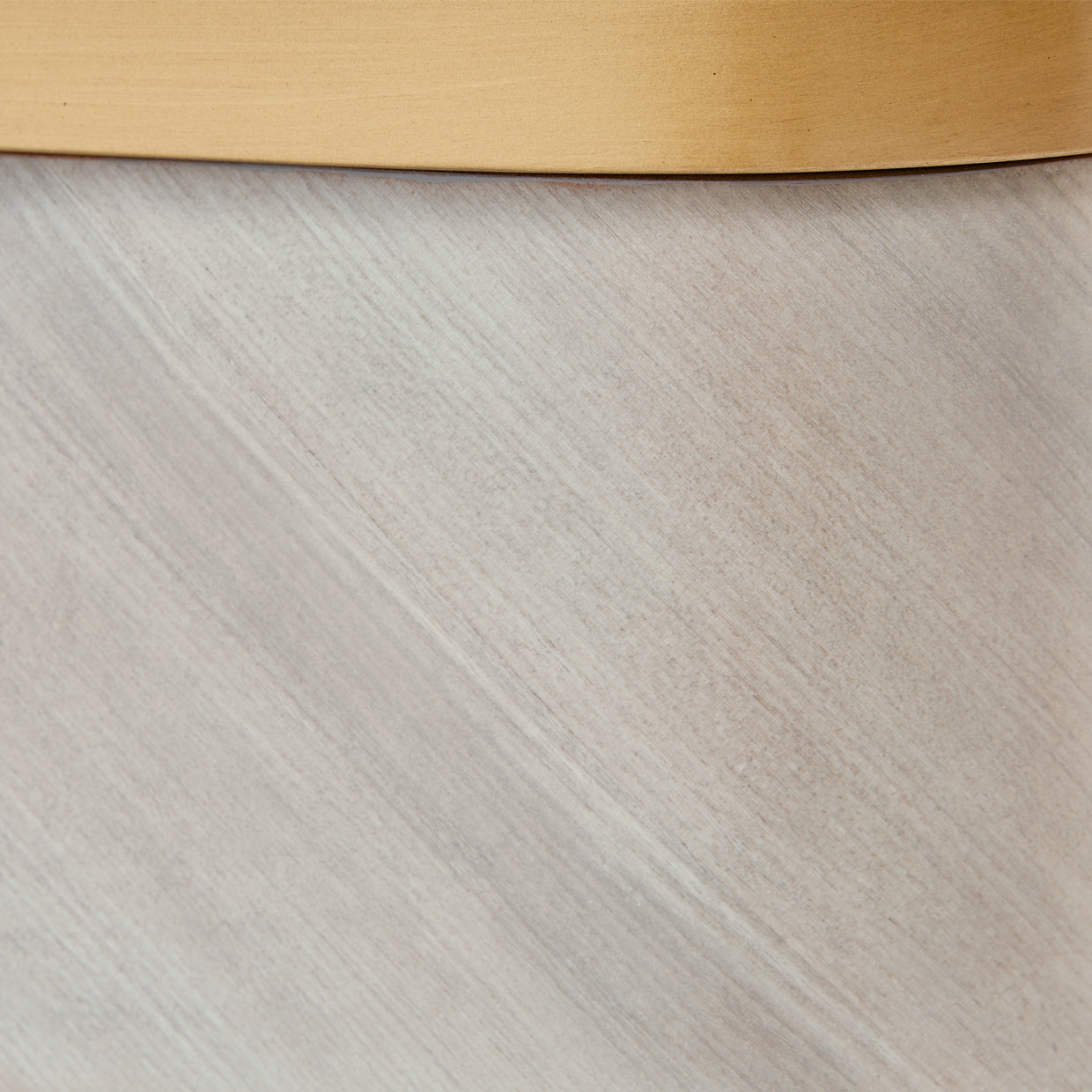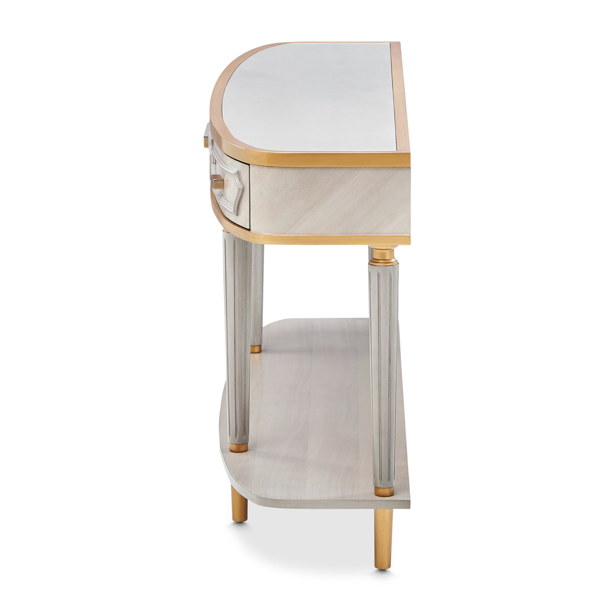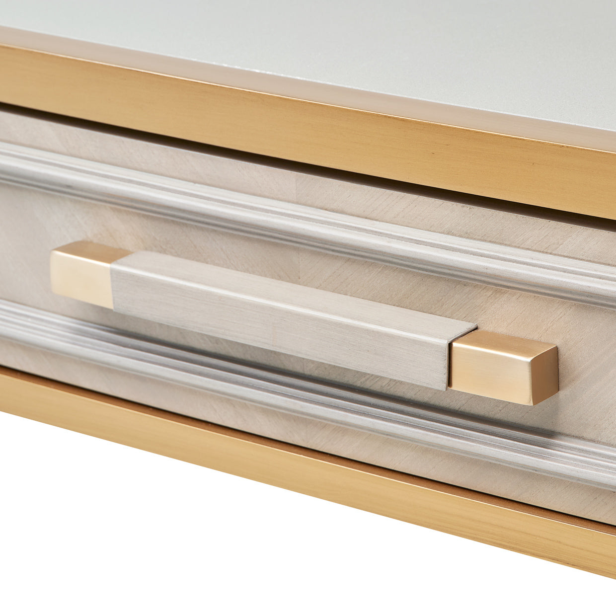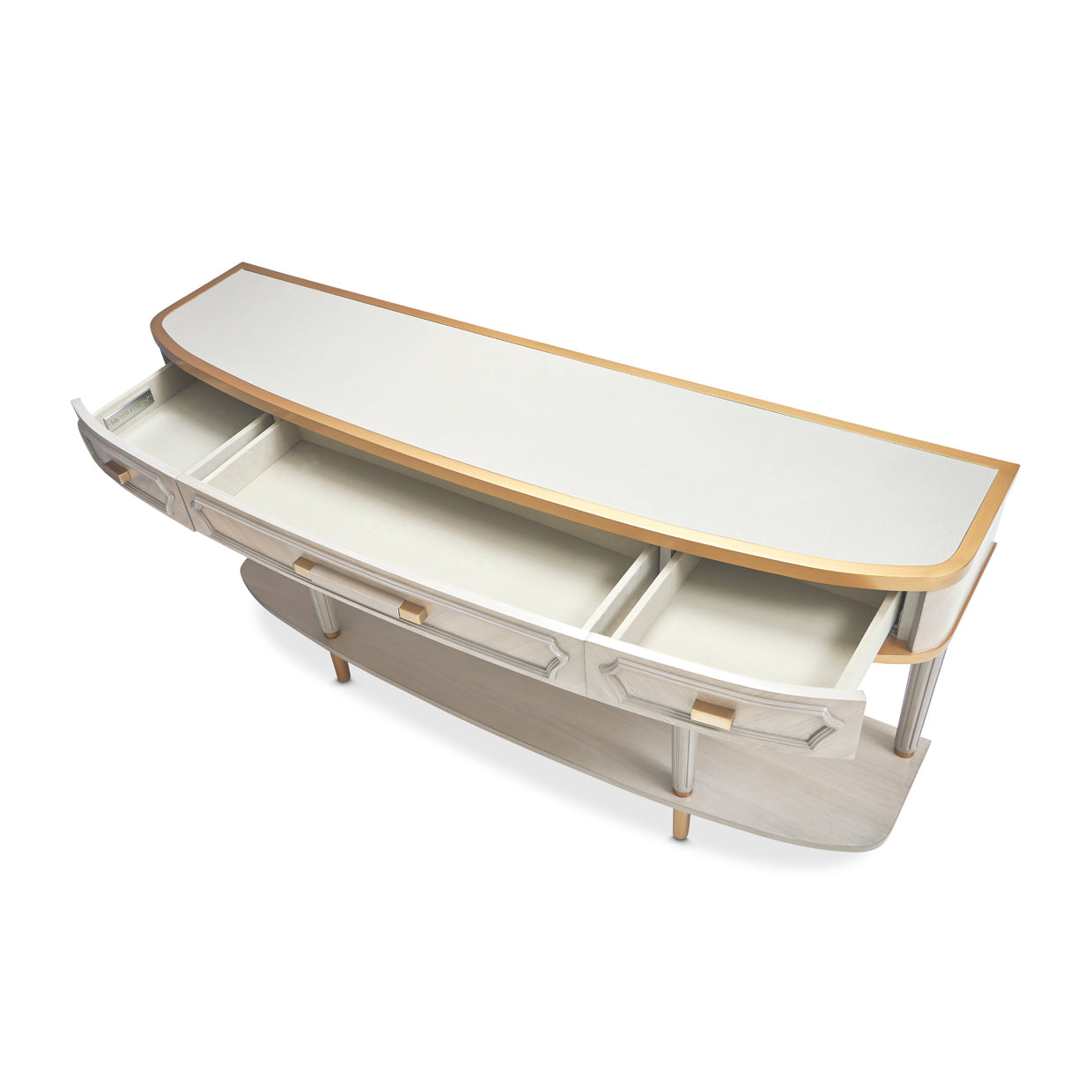 - A striking marble top with a Dove Gray finish, offering ample space for display and function.