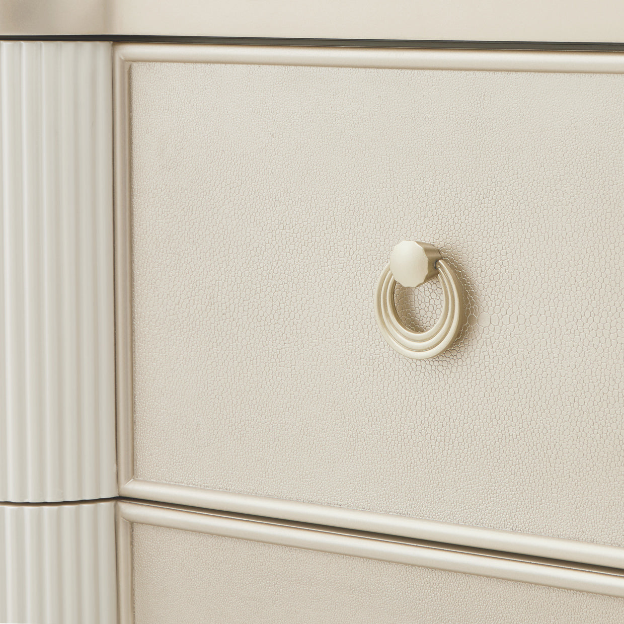 A statement of refined elegance, the La Marisia 5-Drawer Chest exudes sophistication with its tall, statuesque silhouette and graceful detailing. Finished in a soft pearl hue with champagne accents, this piece radiates quiet luxury. The faux-shagreen drawer fronts introduce a sumptuous textural contrast, while delicately ribbed side panels add sculptural depth, echoing the collection’s signature aesthetic.
