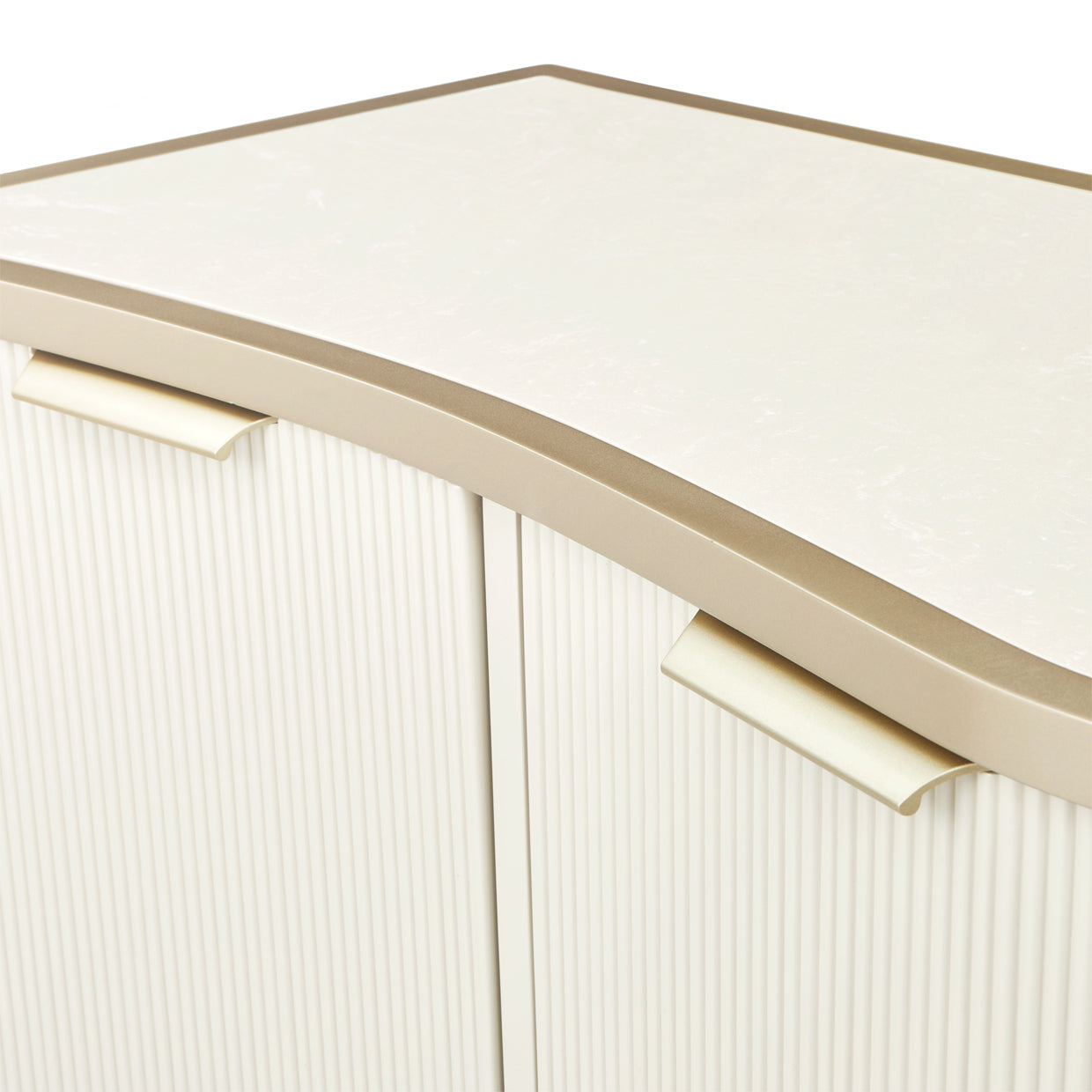 Sculptural elegance meets functional design in the La Marisia Media Cabinet. Designed to command attention, this piece boasts a gracefully curved silhouette finished in a soft pearl hue with champagne accents. A luxurious cultured marble top offers a refined surface for displaying décor or accommodating televisions up to 85 inches. The center cabinet features striking faux-shagreen door fronts, complemented by reeded side doors for a sophisticated interplay of textures. Behind the four cabinet doors, adjustable shelving allows for tailored storage, while soft-close hinges ensure effortless operation.