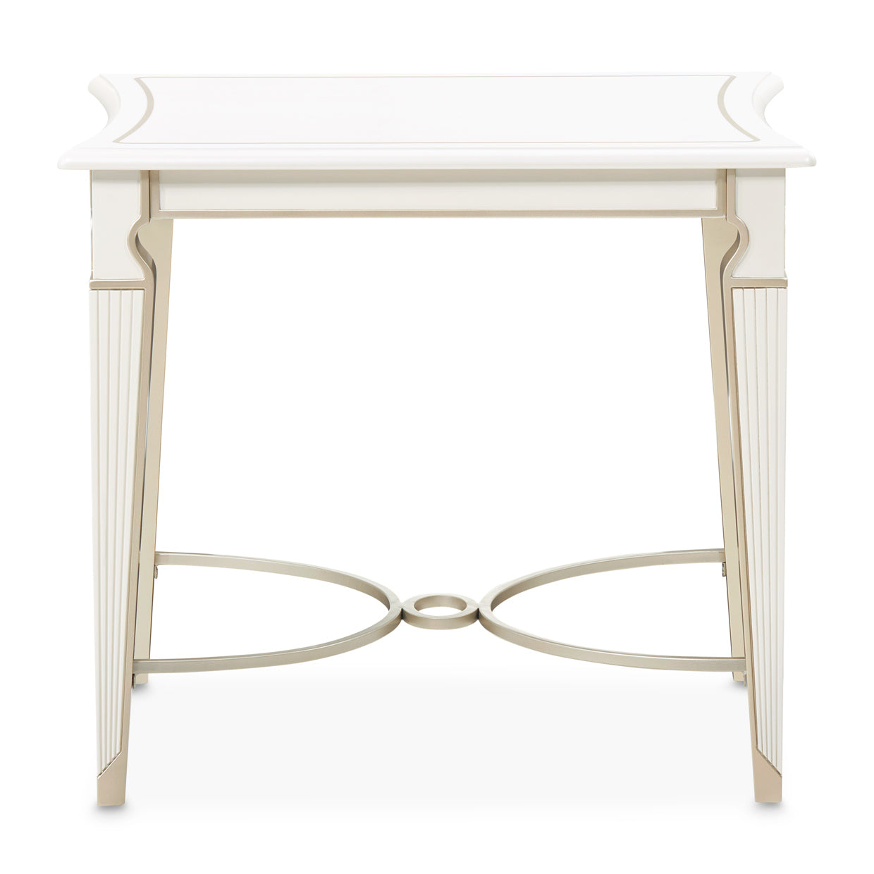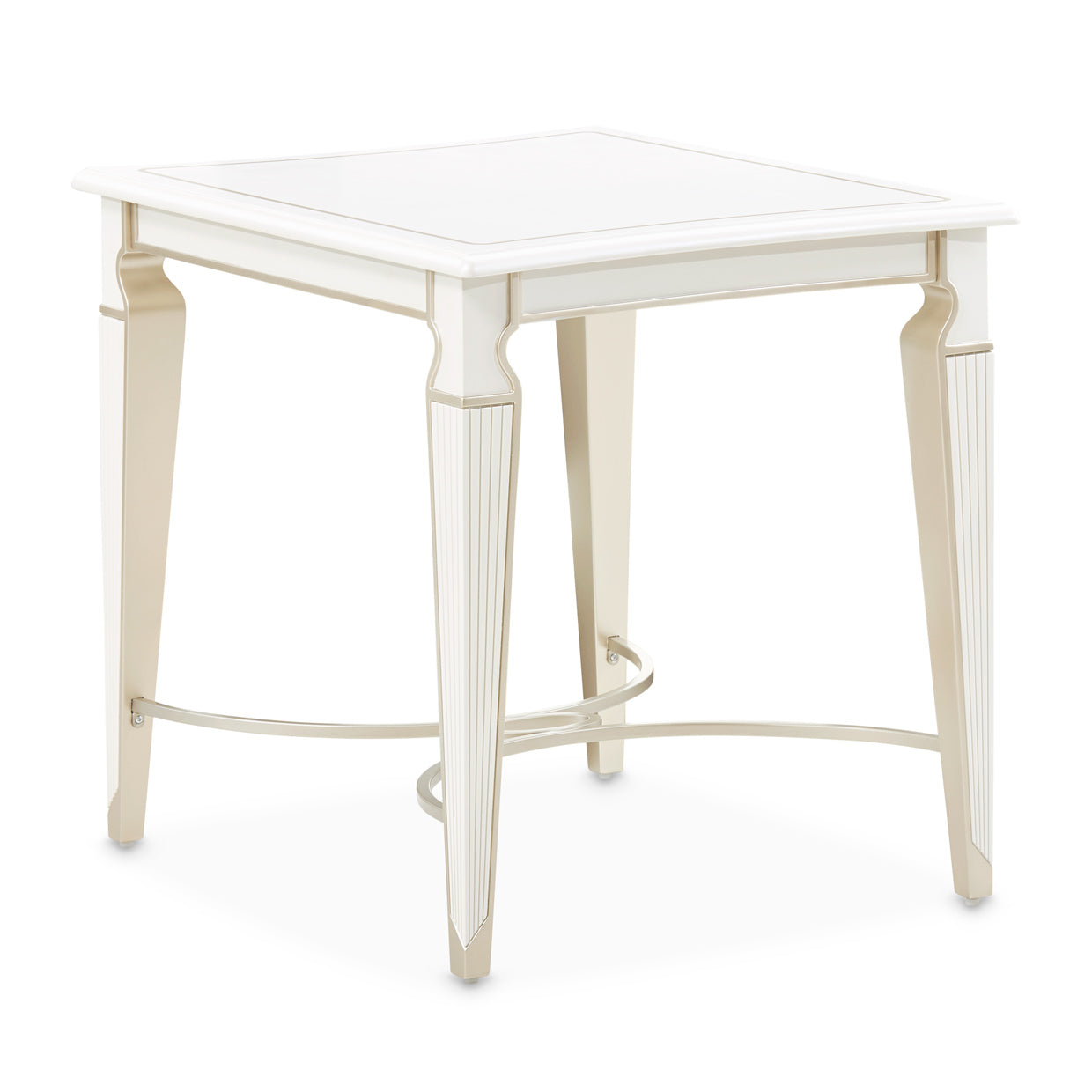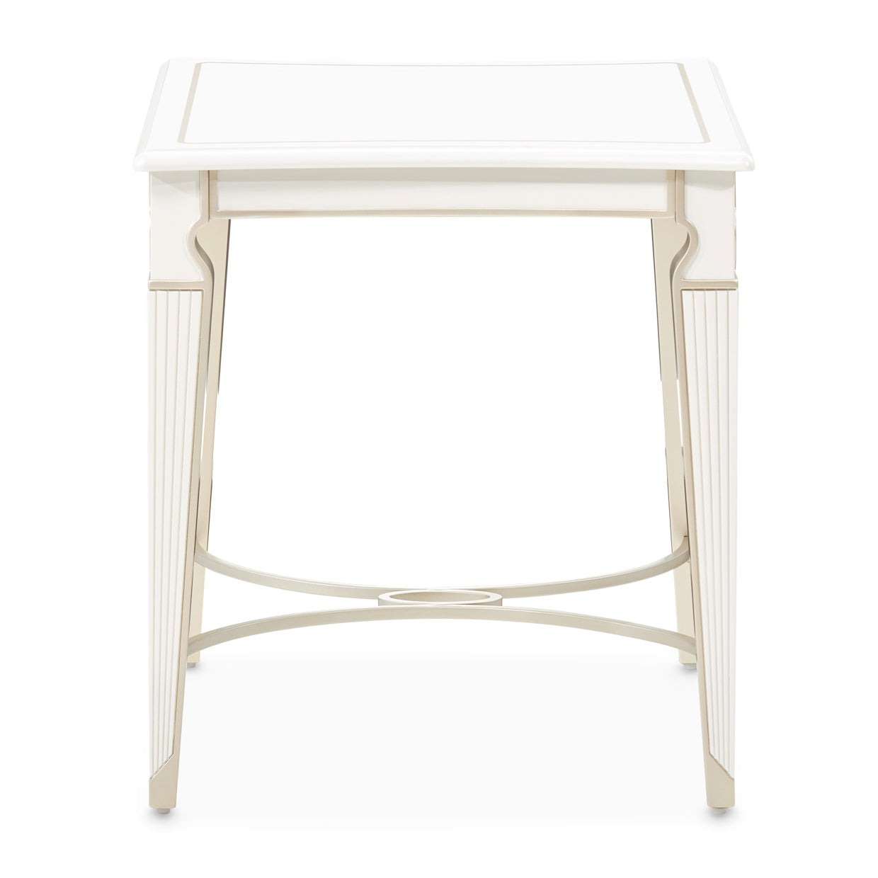 The La Marisia End Table offers a sophisticated accent to your living space with its creamy pearl finish and delicate champagne accents. A subtle painted trim highlights its gently curved silhouette, while the reeded details and tapered legs add refinement. A metal stretcher beneath enhances its elegant structure, making it both stylish and stable. Versatile in function, this table serves as the perfect finishing touch in your living room or as a chic standalone piece.