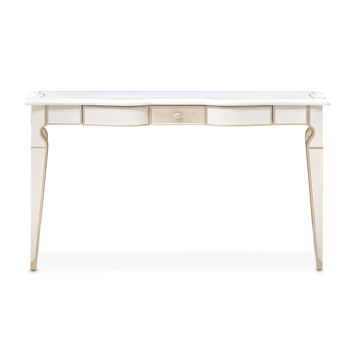The La Marisia Console Table brings elegance and versatility to your space with its graceful silhouette and luxurious details. Finished in a creamy pearl tone with champagne accents, this piece is designed to complement both traditional and contemporary interiors. A birdseye maple veneer adds depth to the tabletop, while a painted trim highlights its sculpted edges. With a velvet-lined drawer featuring a faux-shagreen front, this table is as functional as it is stylish.