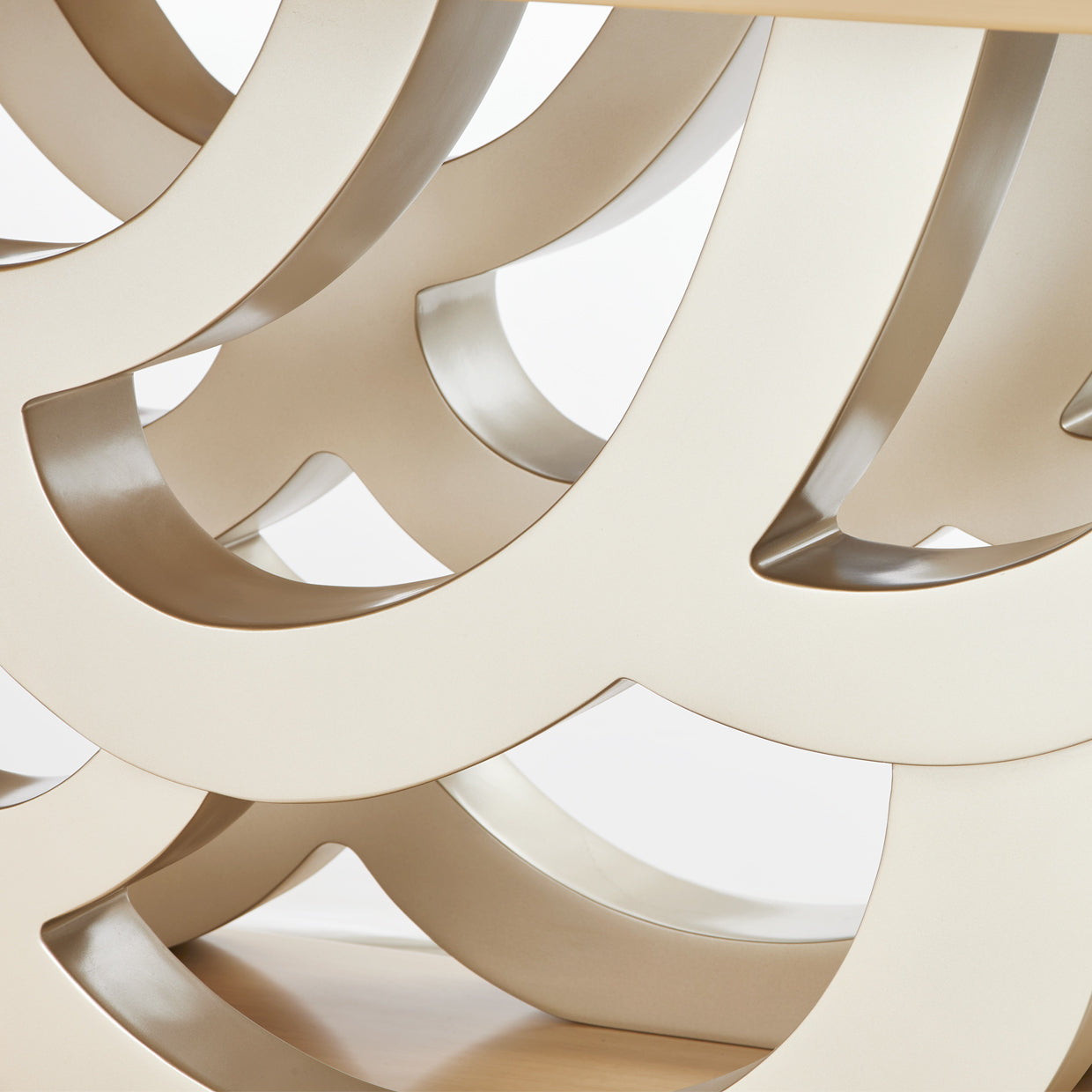 - Champagne gold Pedestal Base: A sculptural base in a warm gold finish offers stability and a bold, artistic aesthetic.
