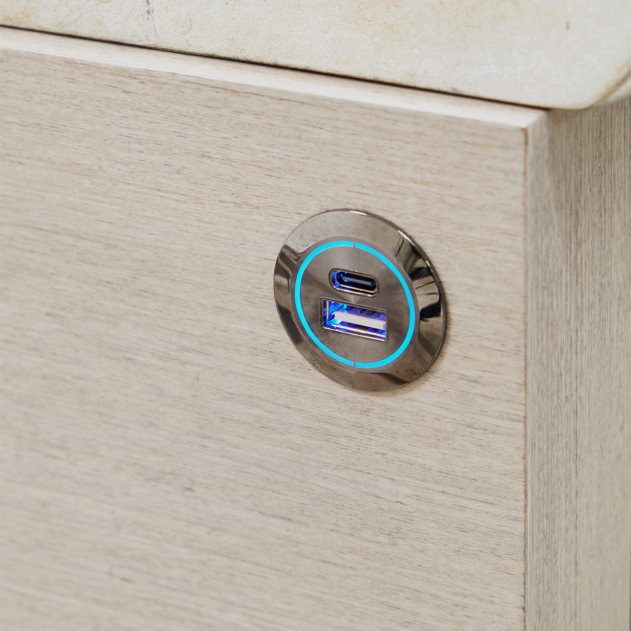 - Luxe Convenience: Discreetly integrated USB ports bring modern ease to your elegant setting.
