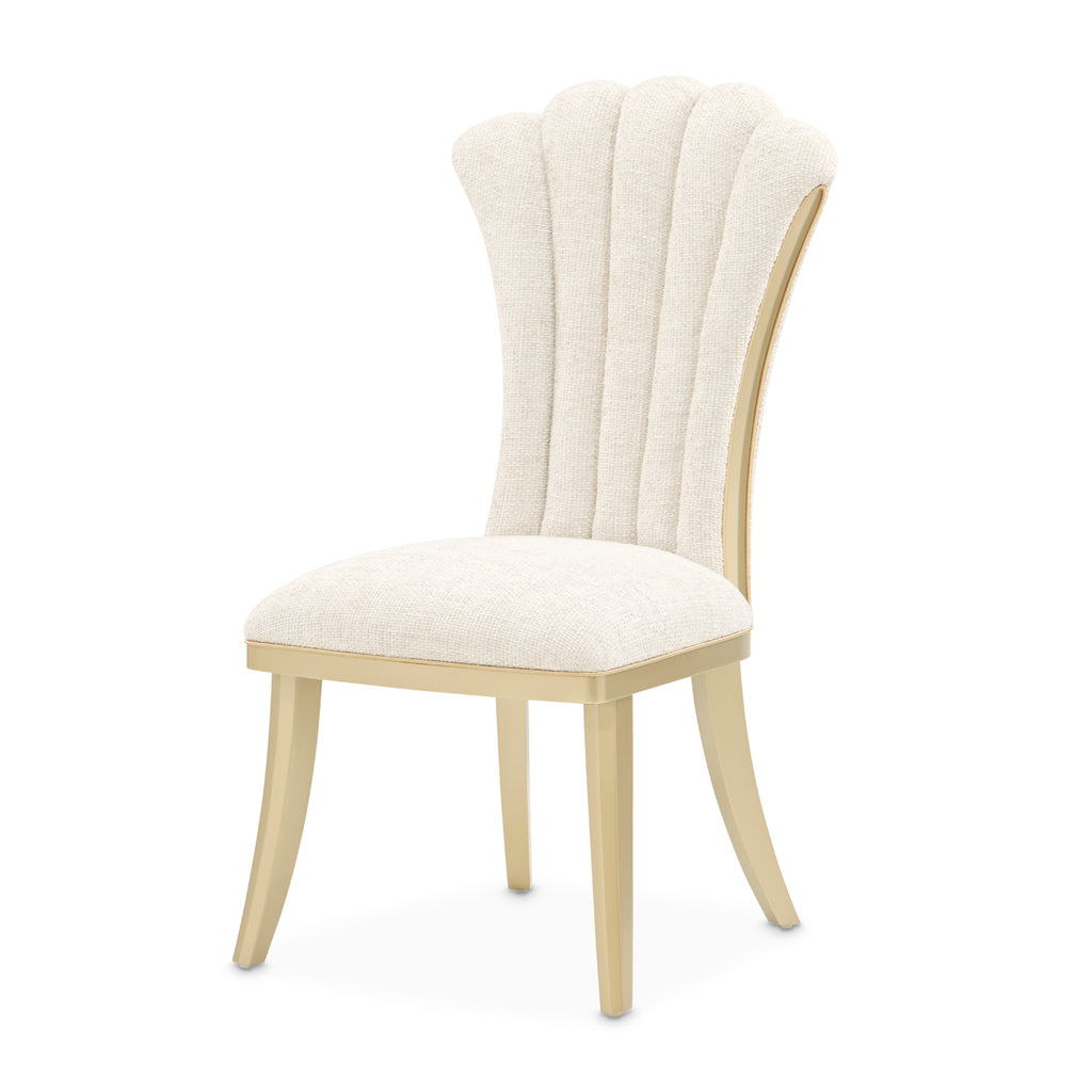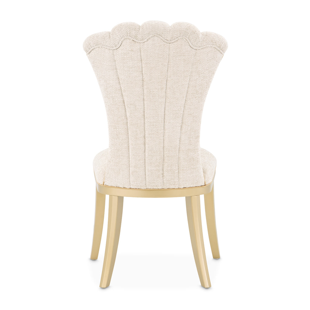 Graceful and sculptural, the Fantosini Gold Side Chair brings elevated comfort to every meal. The channel-tufted backrest fans outward in a sweeping silhouette, drawing inspiration from classic shell motifs with a modern twist. Upholstered in a plush chenille fabric in a soft, natural tone, the chair pairs tactile warmth with luminous detail. Gold-finished inserts trace the sides of the frame for a sleek contrast, while tailored welting enhances its silhouette. Grounded by flared, gold-finished rubberwood legs, this piece offers refined seating with a designer’s eye for form.