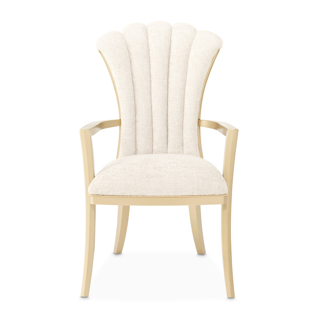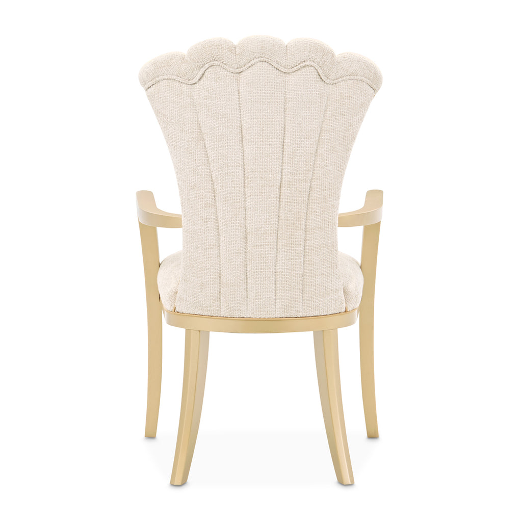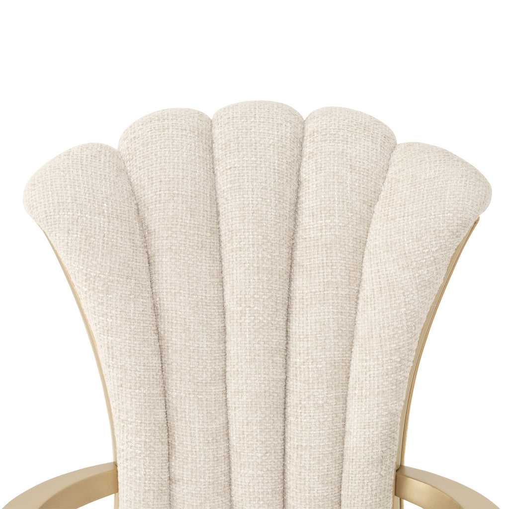 An elegant blend of form and comfort, the Fantosini Gold Arm Chair offers a regal presence at the dining table. The sculpted backrest fans out in graceful channels, enveloped in plush chenille upholstery that radiates softness in a natural beige hue. Framed with gleaming gold-finished inserts and complemented by angular arms, this chair creates a refined seating experience that balances structure with plush comfort. Flared gold-finished legs complete the silhouette, making it a sophisticated choice for both ends of the table.