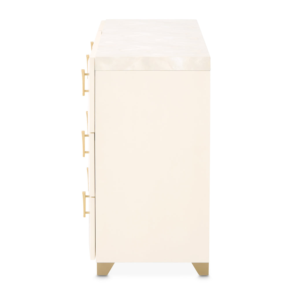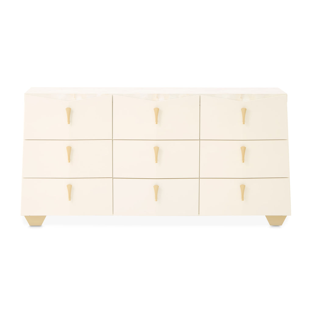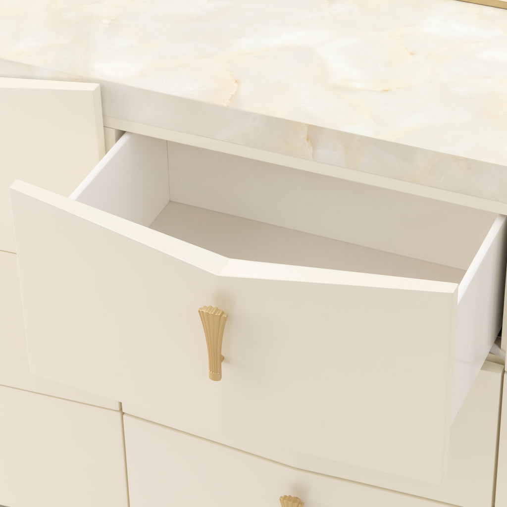 Gracefully sculpted and thoughtfully designed, the Fantosini Gold Dresser is a refined statement of modern glamour. Its striking angled silhouette creates a sense of movement and dimension, accentuated by a smooth, creamy pearl finish that glows softly in any light. The surface is crowned with a radiant onyx-look top, showcasing marbled veining that offers a perfect platform for curated accents. Nine drawers glide open with ease, their velvet-lined bases offering a luxurious home for your wardrobe. A hidden compartment in the bottom right drawer adds a discreet touch of security, blending beauty with purpose.
