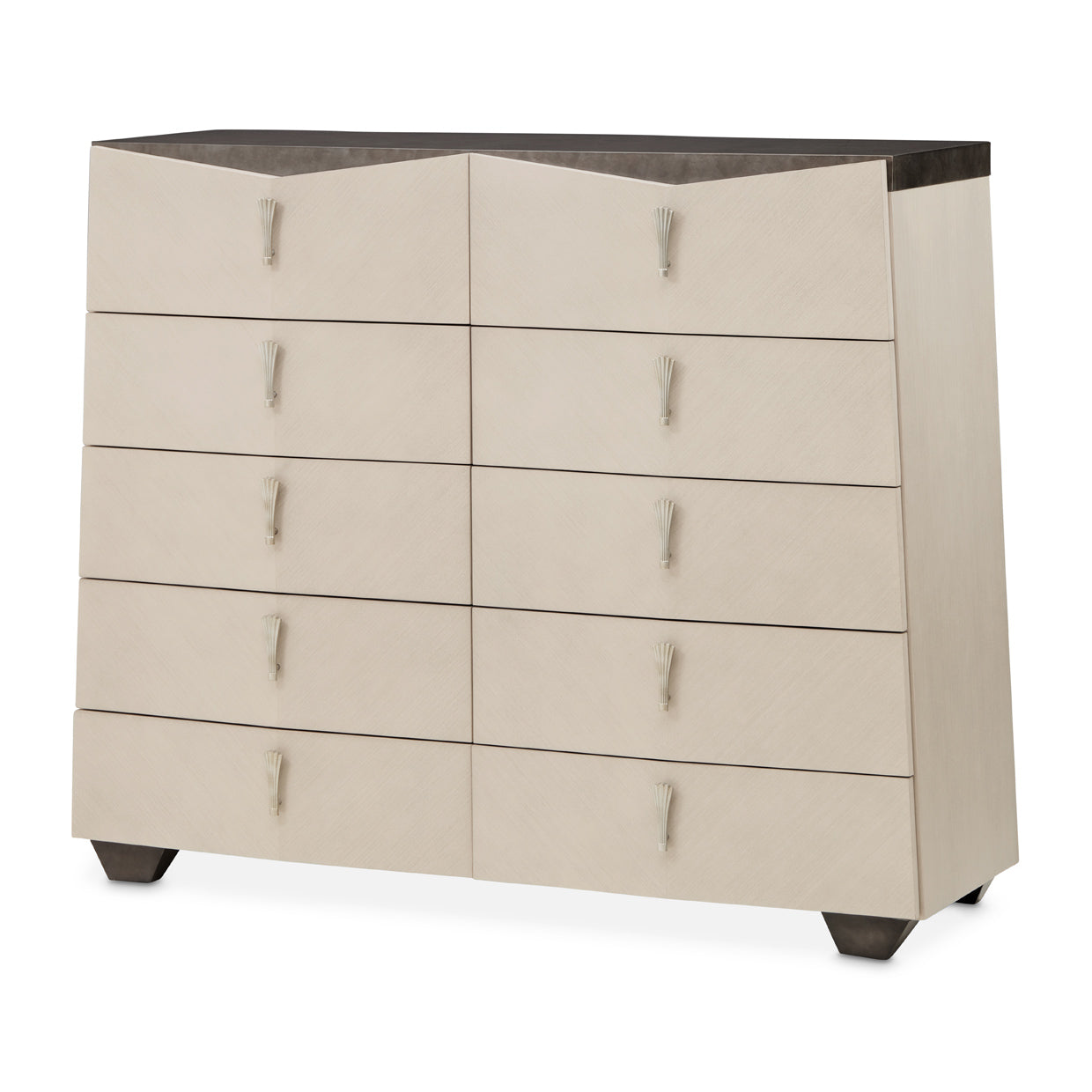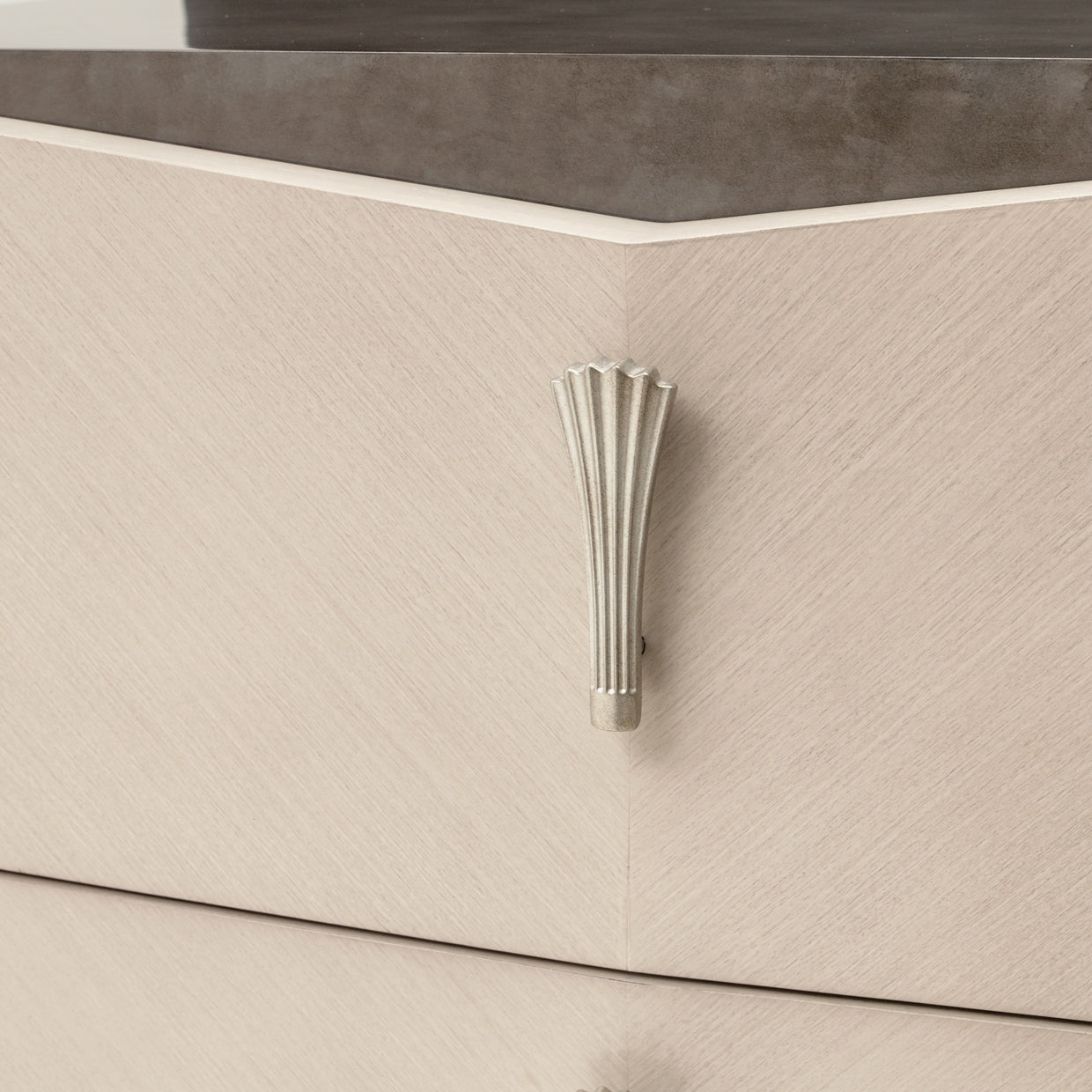 Striking in form and rich in detail, the Fantosini Chest offers a bold interpretation of modern luxury. Its sharply angled silhouette is clad in oak veneers with a soft silver mist finish, giving the piece a radiant, understated elegance. A contrasting top and tapered base introduce depth and dimension, while the fluted metallic hardware lends a graceful, sculptural quality. With ten soft-close drawers, this chest offers generous storage for garments and accessories, all while serving as a commanding focal point in the bedroom.