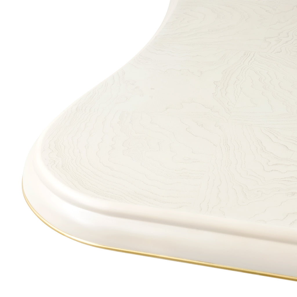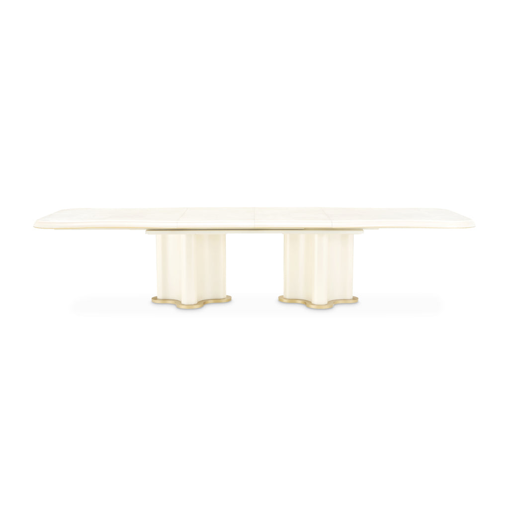 The La Terrazza Rectangular Dining Table is a celebration of refined artistry and architectural elegance. Radiating with a creamy pearl finish, the tabletop showcases a swirl ash veneer arranged in a deliberate, mismatched pattern—creating a dynamic play of grain and texture. Its fluid silhouette is edged in a contoured apron trimmed in gold, tracing every curve with a graceful glint of glamour. Below, a pair of dramatically sculpted pedestal bases anchor the design with sculptural poise, echoing the table’s movement and finished in matching pearl with a lustrous gold trim. Perfect for both everyday luxury and grand entertaining, the table includes two extension leaves that allow you to expand the setting with ease. When fully extended, it offers a generously scaled surface that comfortably seats up to ten guests in style.
