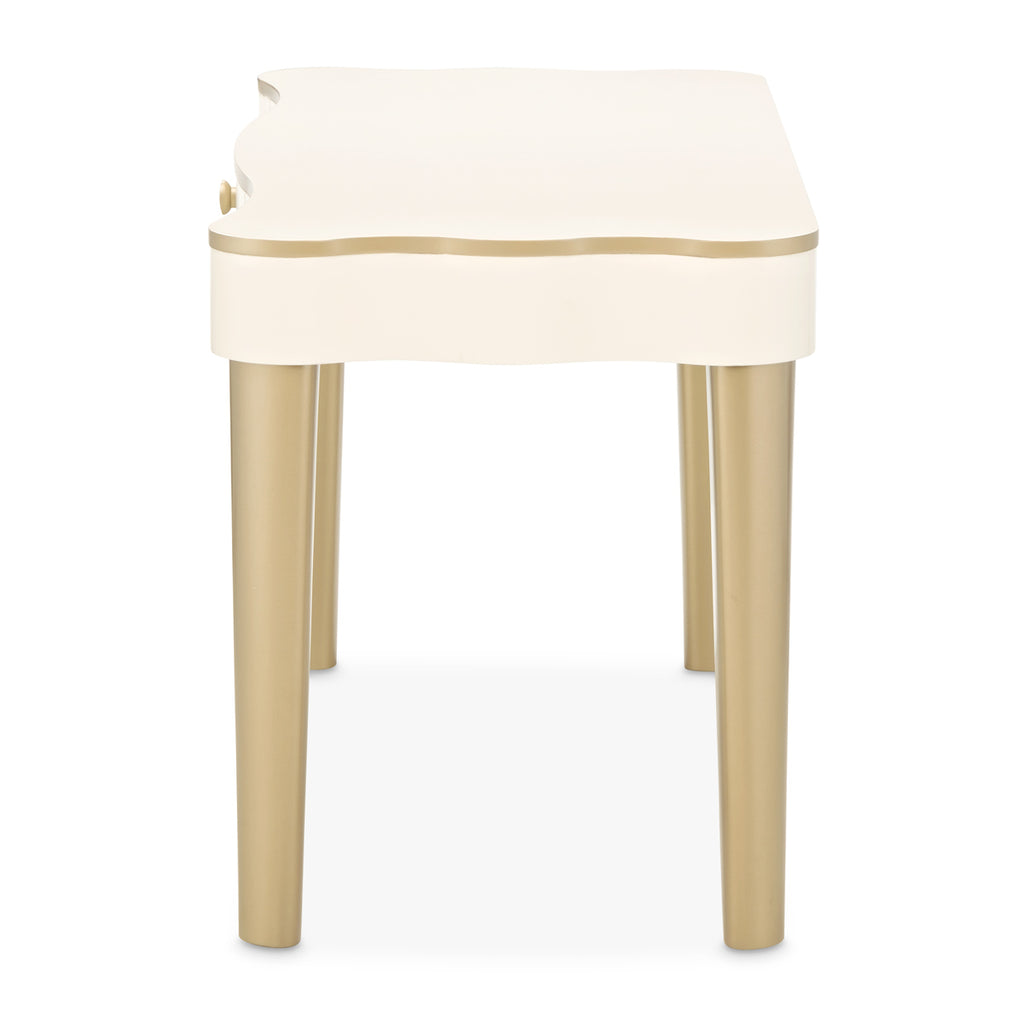 Striking the perfect balance between style and function, the La Terrazza Vanity Desk brings sculptural elegance to any room. Its flowing wavy silhouette is wrapped in a creamy pearl finish, complemented by bold tapered legs in a lustrous gold tone. Whether used as a statement vanity or a refined writing desk, this piece offers graceful versatility. Three drawers keep beauty or office essentials neatly tucked away, while a finished back allows for floating placement in open floorplans. Understated yet impactful, it brings a touch of luxury to bedrooms, dressing rooms, or home offices alike.