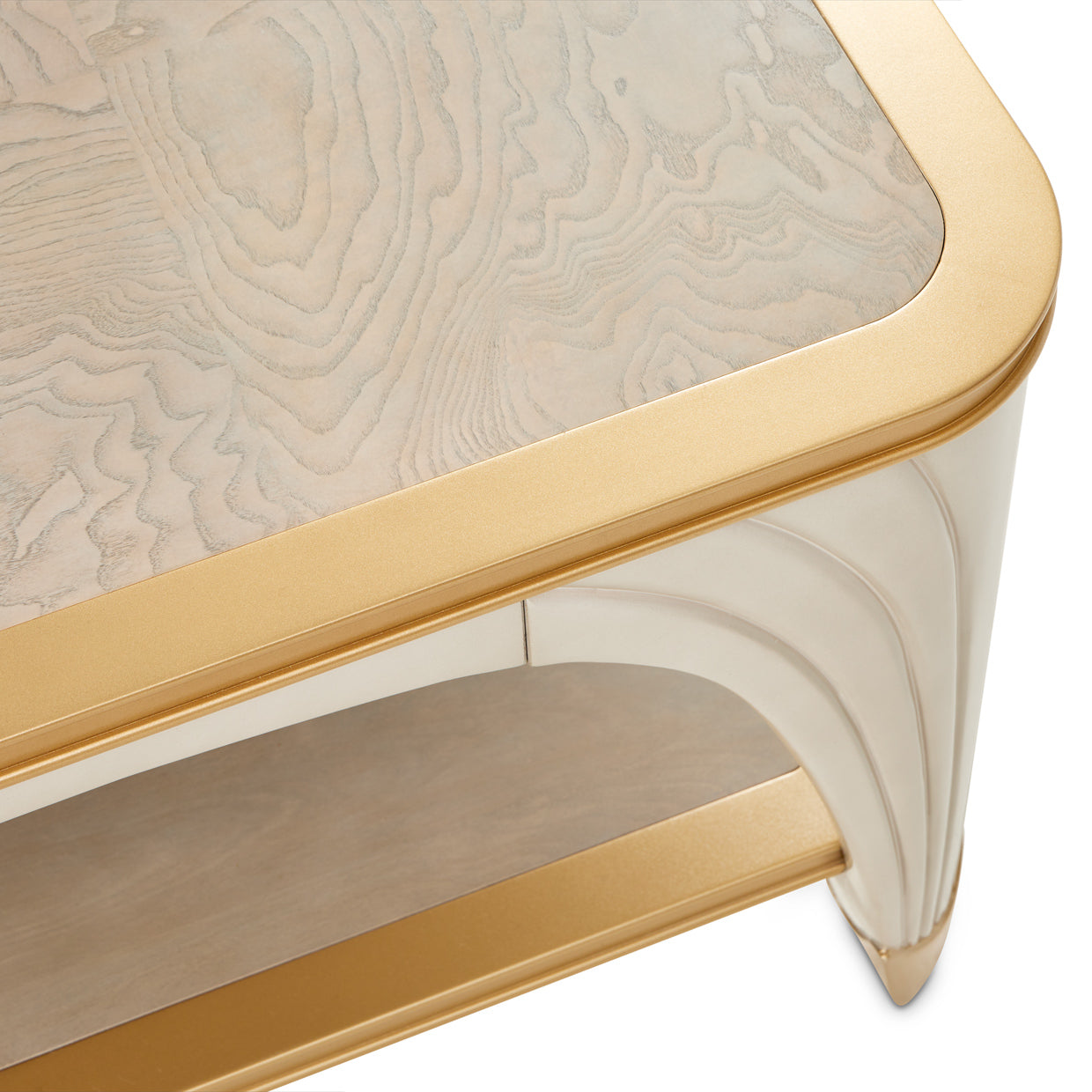 The La Terrazza Cocktail Table finished in soft Silver Mist with delicate champagne accents, infuses elegance and modernity into any room with its sleek form and refined details. The top features a stunning swirl ash veneer inlay while the sculpted legs flow gracefully, creating a fluid visual rhythm. A spacious lower shelf provides ample space for display or storage, while champagne trim adds a touch of luxurious shimmer.