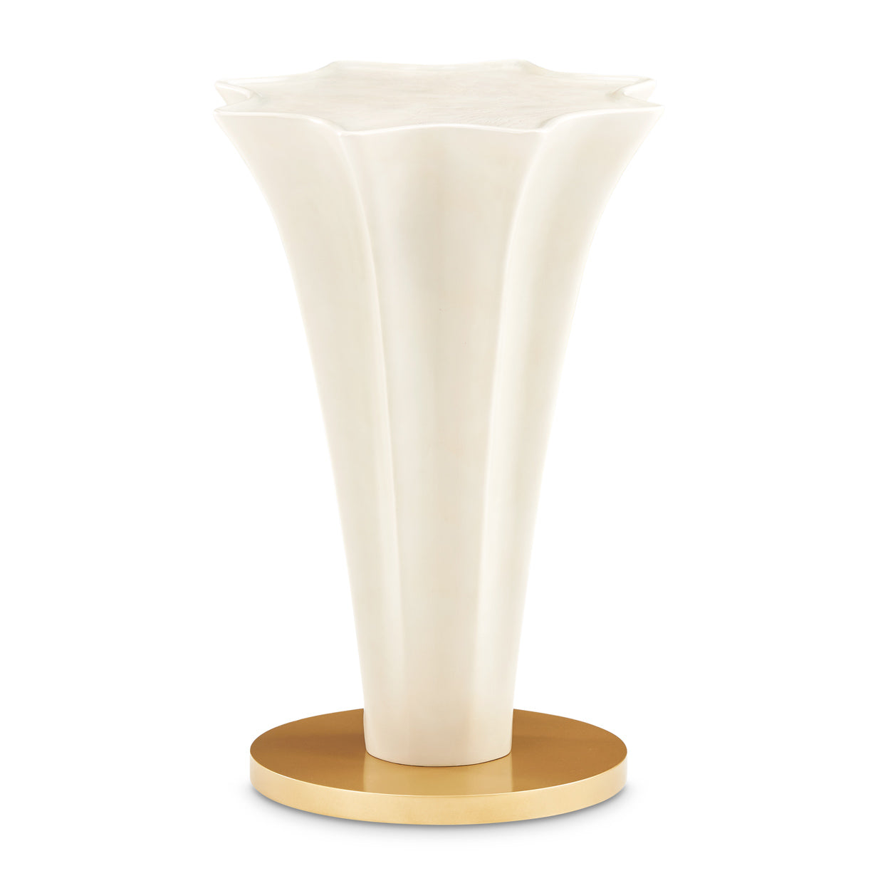 The La Terrazza Chairside Table is a sculptural masterpiece that seamlessly blends art and functionality. Rising gracefully from a champagne-finished circular base, it captures the essence of a blooming flower in motion. Smooth surfaces and fluid lines create a visual symphony that captivates the senses.