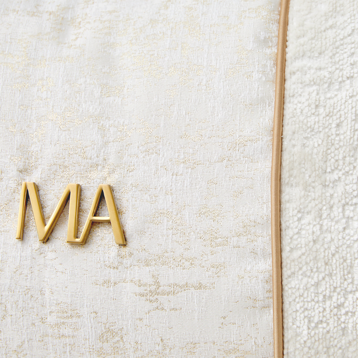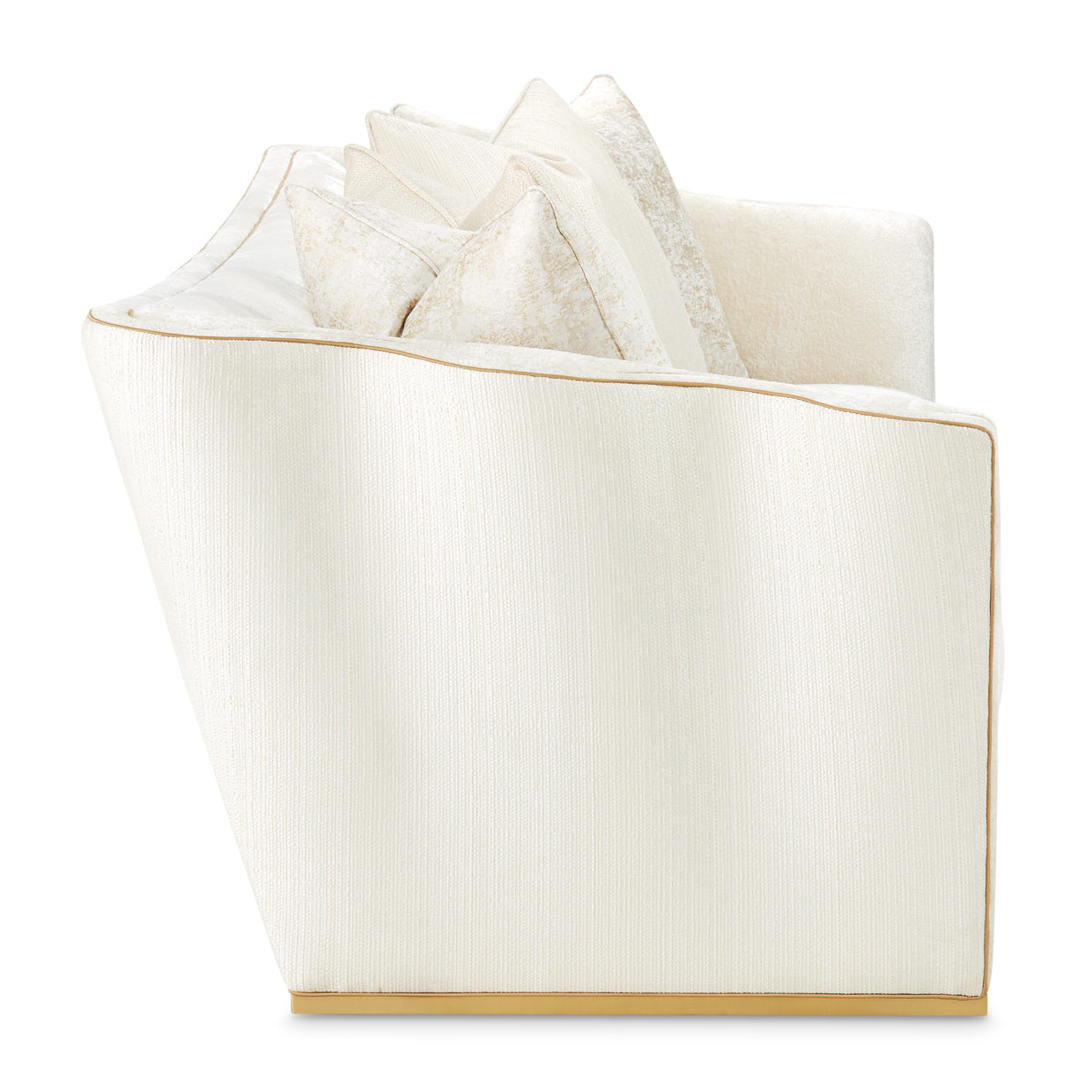 - Elegant champagne-toned piping highlights the sofa’s sculptural curves and adds a shimmer of refined luxury.