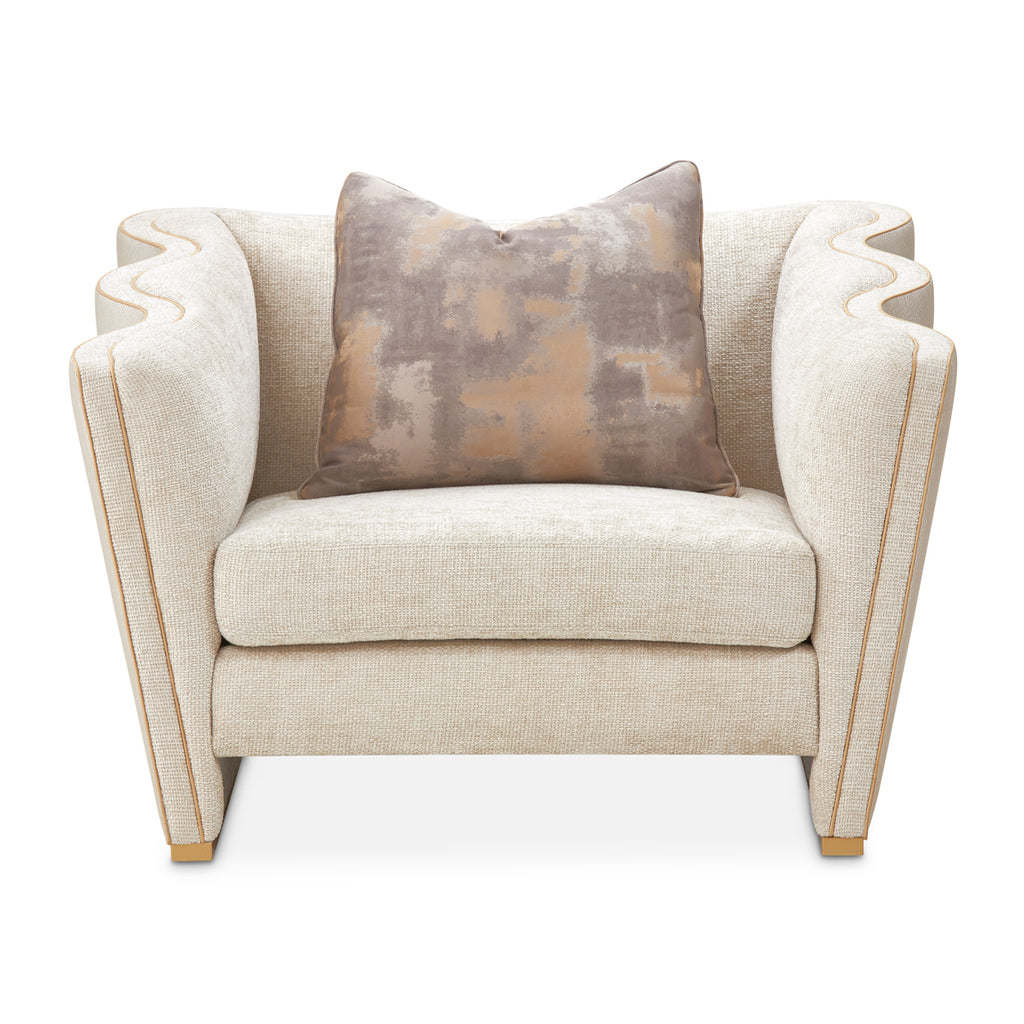 Embrace the perfect harmony of grace and comfort with the La Terrazza Matching Chair, offering an indulgent seating experience. Its elegantly curved arms feature signature undulating edges, creating a visual rhythm that flows seamlessly throughout the piece. The back panel showcases tailored piping and fluid curves, ensuring this chair is stunning from every angle. The interior is upholstered in plush Cappuccino woven chenille, while the exterior boasts a tactile, woven jacquard fabric. This chair envelops you in a cocoon of comfort and style.