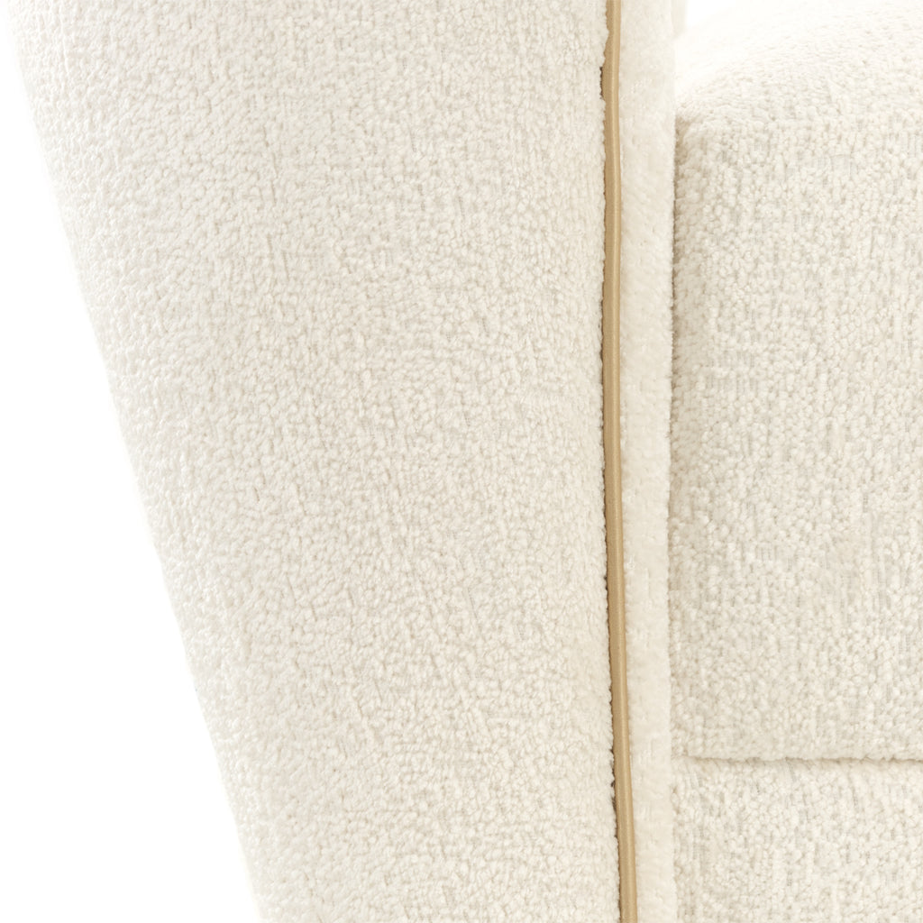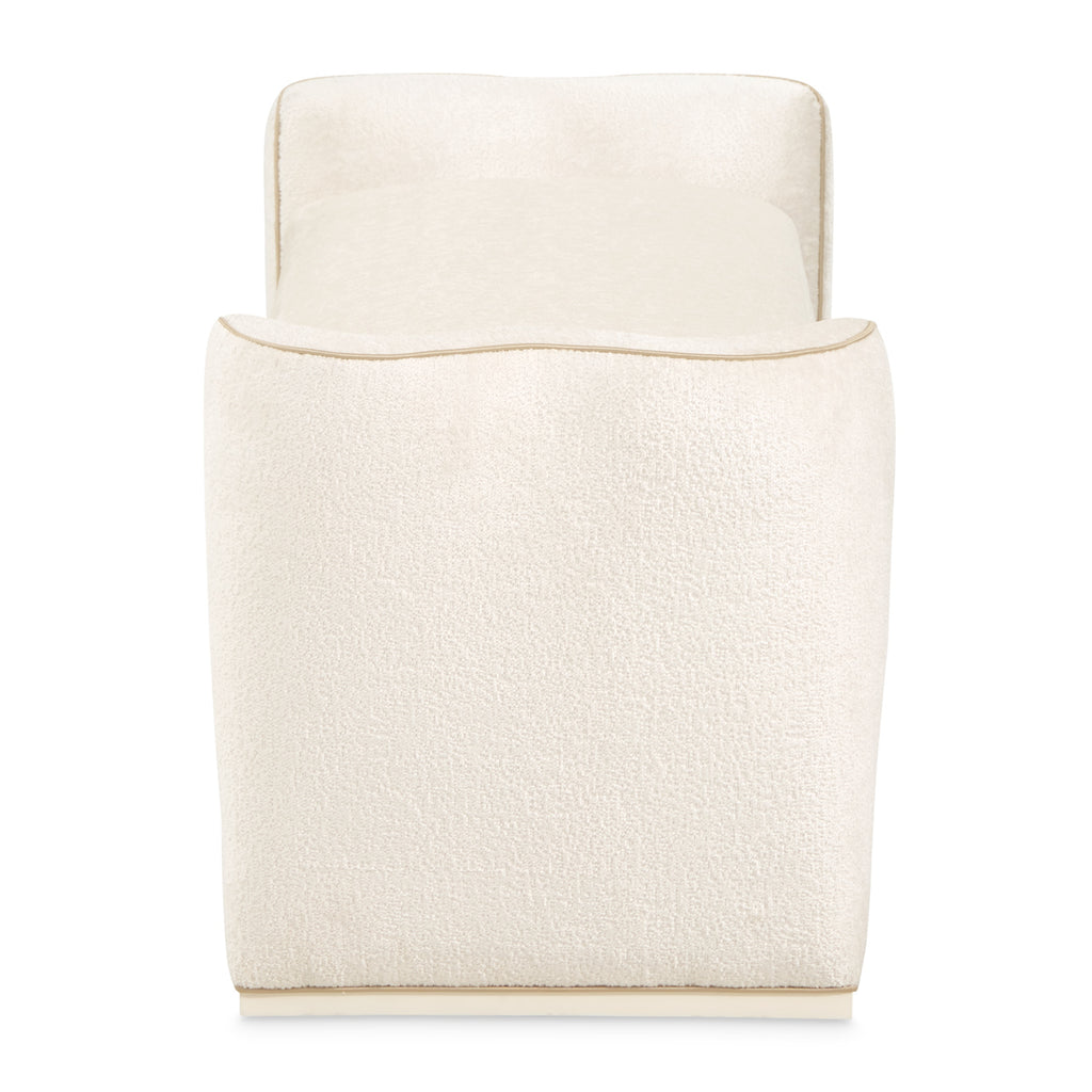 Graceful and versatile, the La Terrazza Bed Bench brings refined comfort to any room. Echoing the collection’s signature wavy lines, its sculptural silhouette is fully upholstered in ultra-plush jacquard chenille in a soft starlight hue. Bold welting traces each curve, adding definition and visual movement, while the generously cushioned foam seat offers lasting comfort. Whether placed at the foot of the bed, styled as a chic hallway accent, or used for extra seating in the living room, this bench blends luxury with everyday functionality.