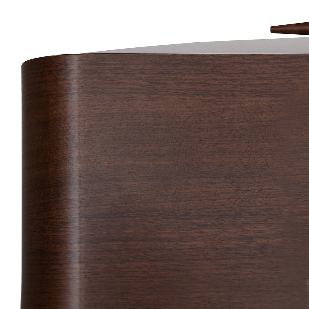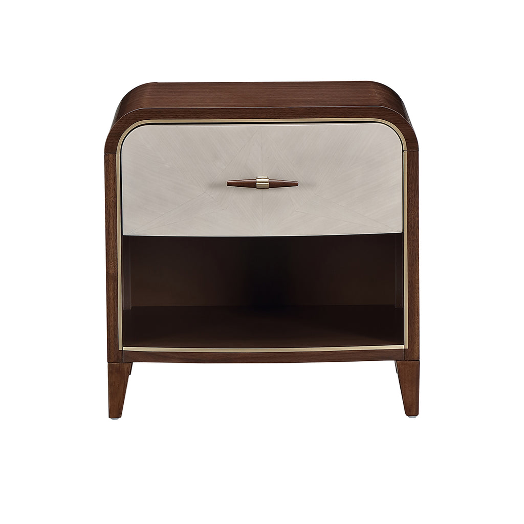The Houston 1-Drawer Nightstand delivers refined sophistication with a contemporary edge. A walnut-finished frame provides warmth and depth, while the gray drawer front showcases a subtly textured starburst pattern accented with a delicate gold trim. Designed for both function and style, this piece features a velvet-lined soft-close drawer for discreet storage and a spacious open shelf below—perfect for books, décor, or personal accents.