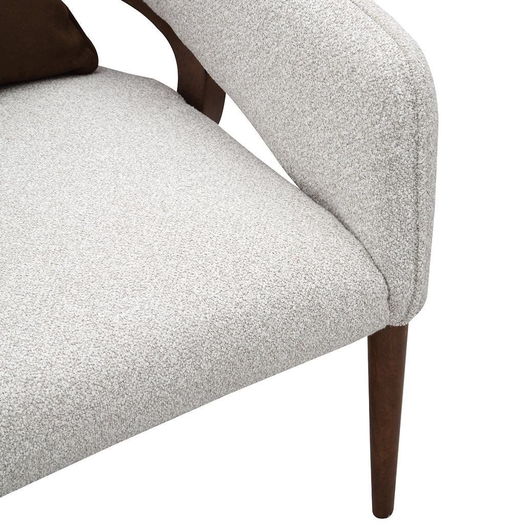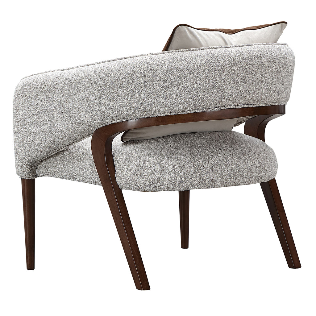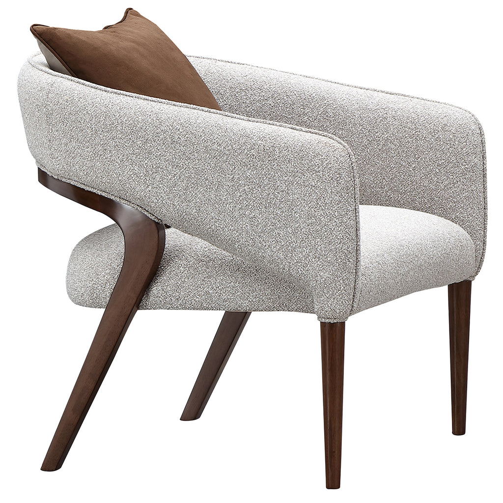 The Houston Accent Chair brings modern sophistication with a nod to mid-century elegance. Upholstered in a luxurious mingled boucle, its subtle blend of gray, ivory, and tan creates a refined and inviting look. The sculptural wood frame, finished in warm walnut, adds depth and contrast, while the curved barrel-back silhouette provides a stylish embrace. A reversible feather-filled accent pillow offers versatility in styling. Whether placed as a statement piece in any room or paired with the Houston collection, this chair elevates your space with understated glamour.
