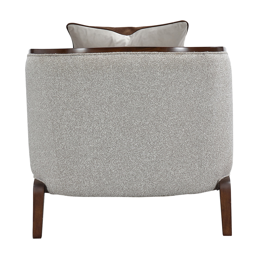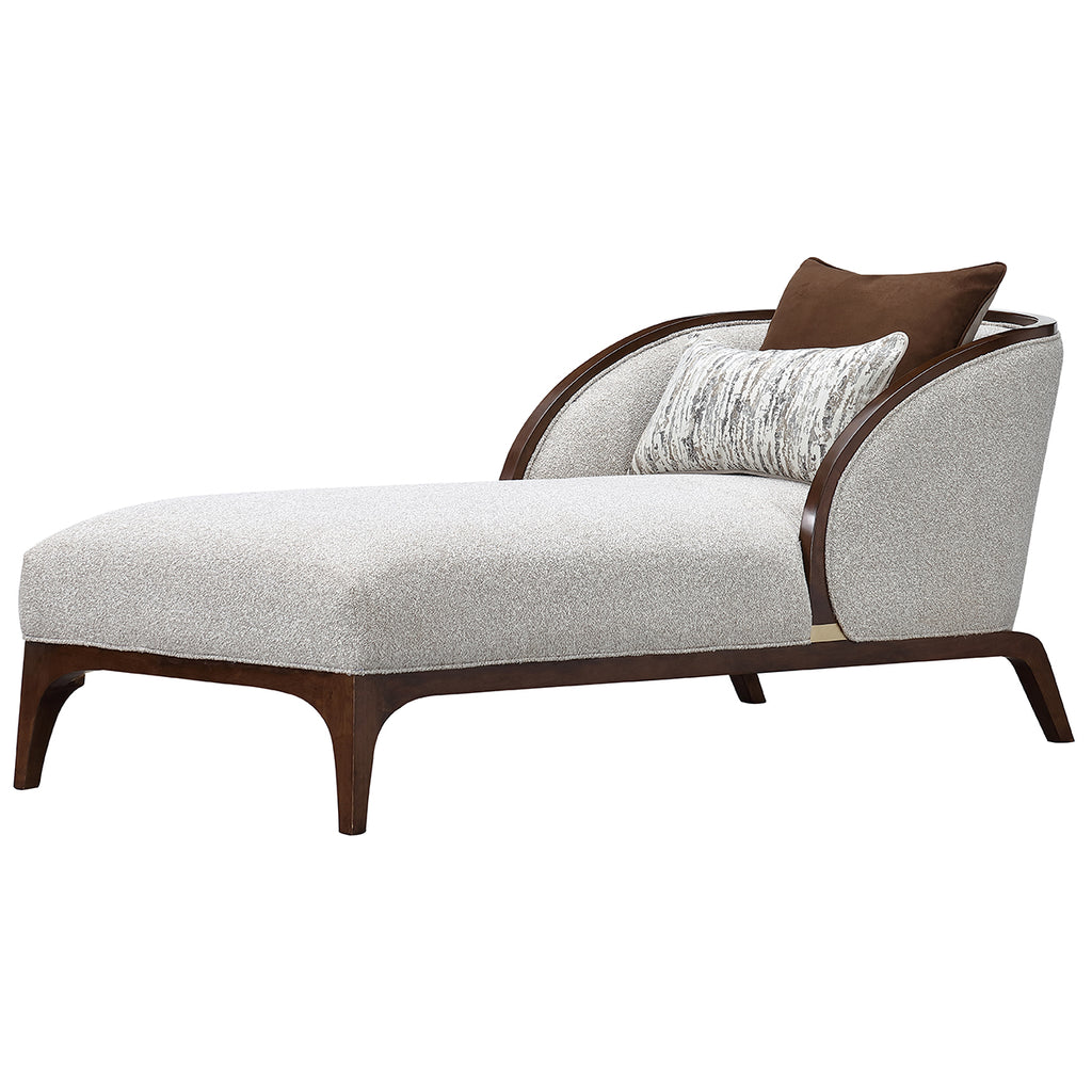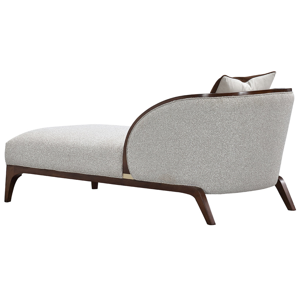 Unwind in style with the Houston Chaise, a luxurious addition to your living space. Upholstered in a mingled boucle fabric with soft hues of gray, ivory, and tan, this chaise blends understated elegance with modern comfort. The sculptural wood frame, finished in rich walnut with painted gold accents, adds a sophisticated contrast. A reversible feather-filled pillow provides a versatile touch to suit your aesthetic.