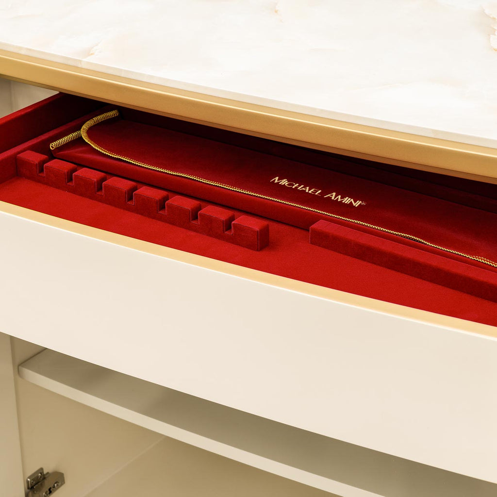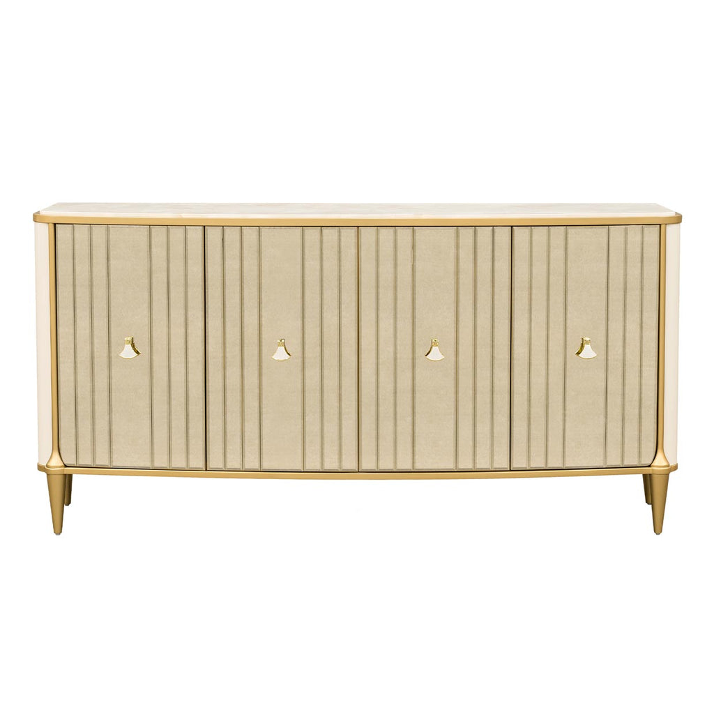 Infuse your dining space with brilliance and grandeur with the Scotts Square Sideboard. A light champagne finish and gleaming gold trim set the stage, while antique mirrored door fronts create a dazzling interplay of light and reflection. The vanilla onyx-look top adds a luminous, sophisticated surface perfect for serving or styling. Behind the soft-close doors, adjustable shelving and velvet-lined drawers provide elegant, tailored storage, including a specially crafted silverware tray. Finished with sculptural mother-of-pearl hardware, this piece transforms everyday entertaining into an art form.