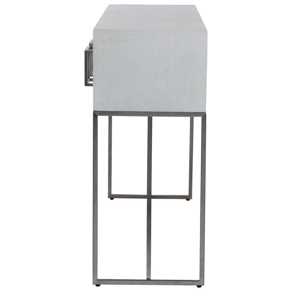 Clean Contemporary Styling, Featuring Oak Veneer Finished In A Soft White With Light Gray Distressing. Accented With Statement Hardware In Brushed Nickel Stainless Steel With A Coordinating Base. Has Two Double Drawers And One Single Drawer In The Center.