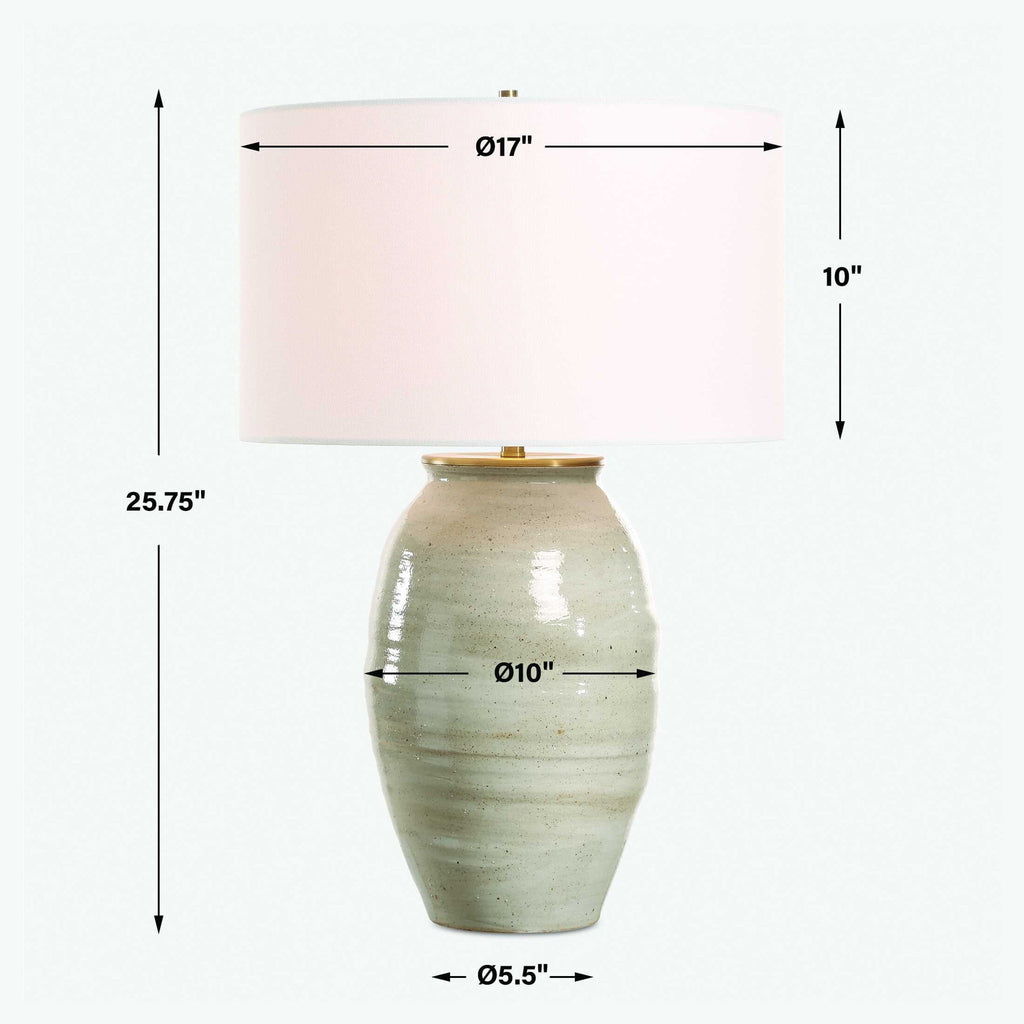 This Ceramic Table Lamp Features A Rustic Light Gray Glaze Paired With Heavily Antique Gold Accents. The Round Hardback Shade Is Covered In A Timeless White Linen Fabric. Due To The Nature Of Fired Glazes On Ceramic Lamps, Finishes Will Vary Slightly.
