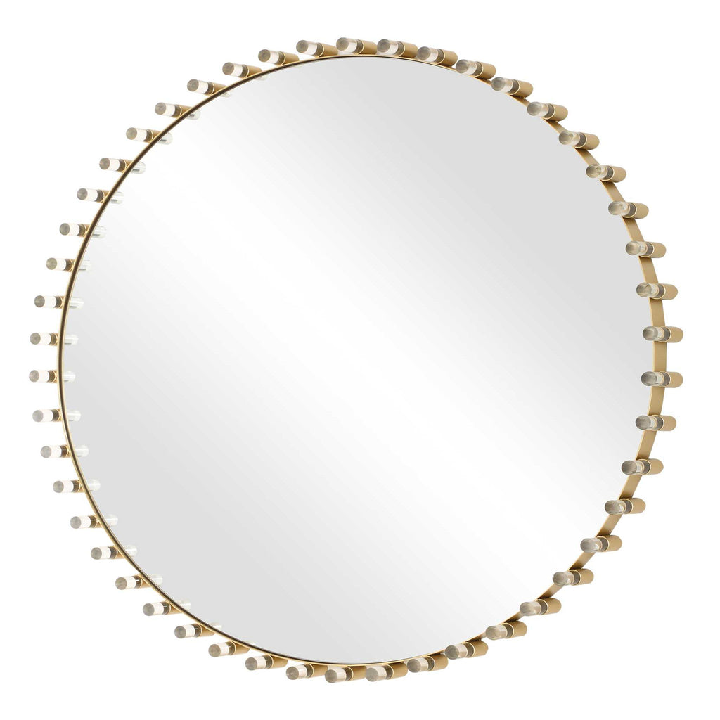 The Avelyne Round Mirror Blends Elegance With Modern Design, Featuring A Plated Antique Brass Outer Frame That's Surrounded By Thick Acrylic Rods.