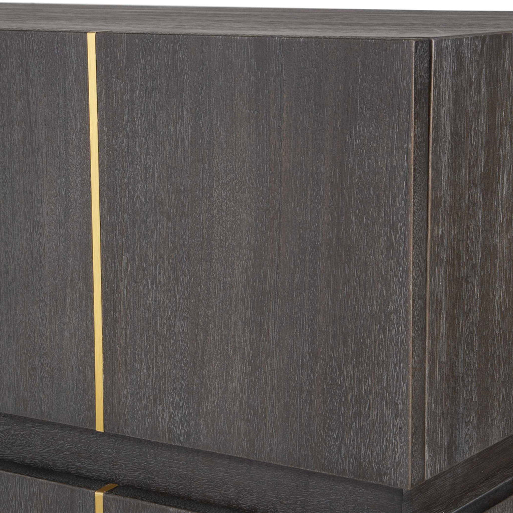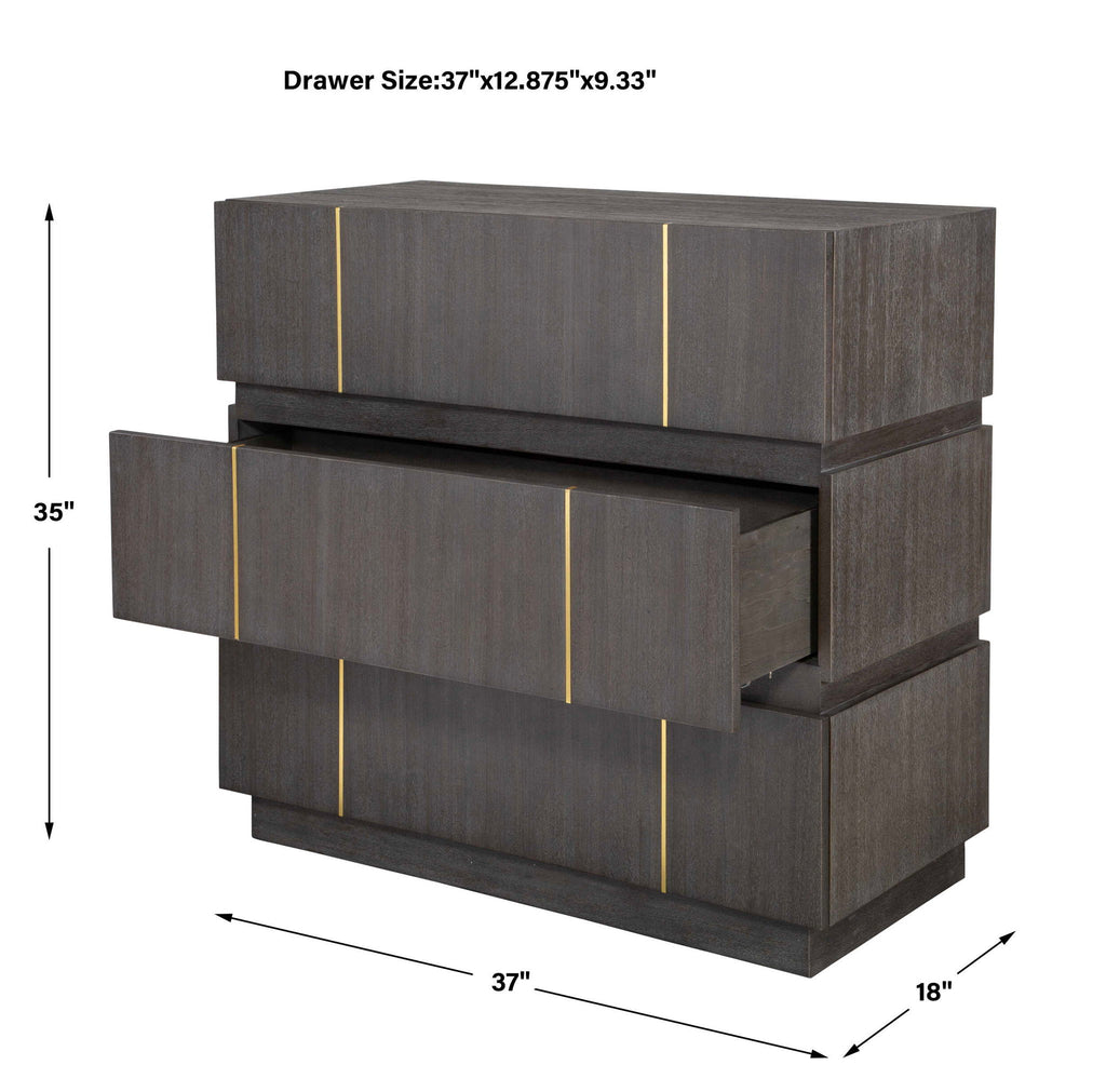 A Clean And Refined Accent Chest Featuring Three Acacia Veneer Drawers In Dark Walnut. The Richness Of The Wood Grain Is Brought To Life By Stunning Brass Finished Accents.