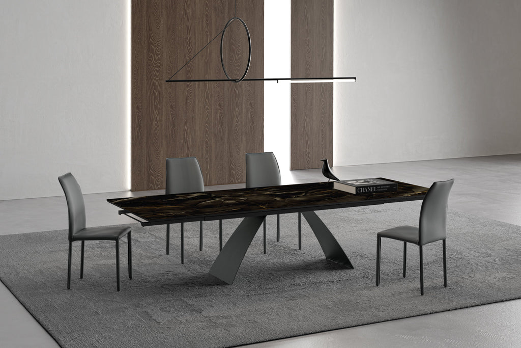 This stunning table features a sleek base in an anthracite or kalkbeige finish, providing a sturdy foundation and contemporary aesthetic. Topped with a premium ceramic surface available in beautiful finishes such as Pampa, Onice Nero, Onice Avorio, and Silver Root Matte, it offers both beauty and durability.