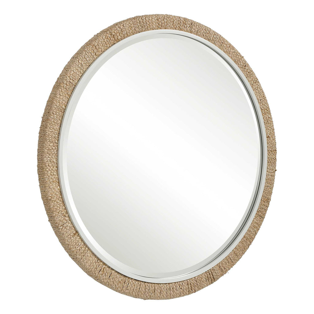 Influenced By Modern Coastal Style, This Round Mirror Has A Braided Banana Leaf And Matte White Frame Exuding A Light And Airy Feel. The Piece Is Accented By A Generous 1 1/4" Bevel.