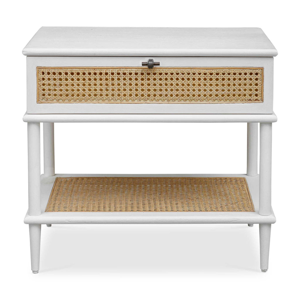 This Side Table, Crafted From Mindi Wood Showcases Natural Rattan Cane Webbing On The Drawer Front And Lower Shelf. It Is Beautifully Accented With Bronze Hardware, Adding A Touch Of Contemporary Elegance To Its Design.