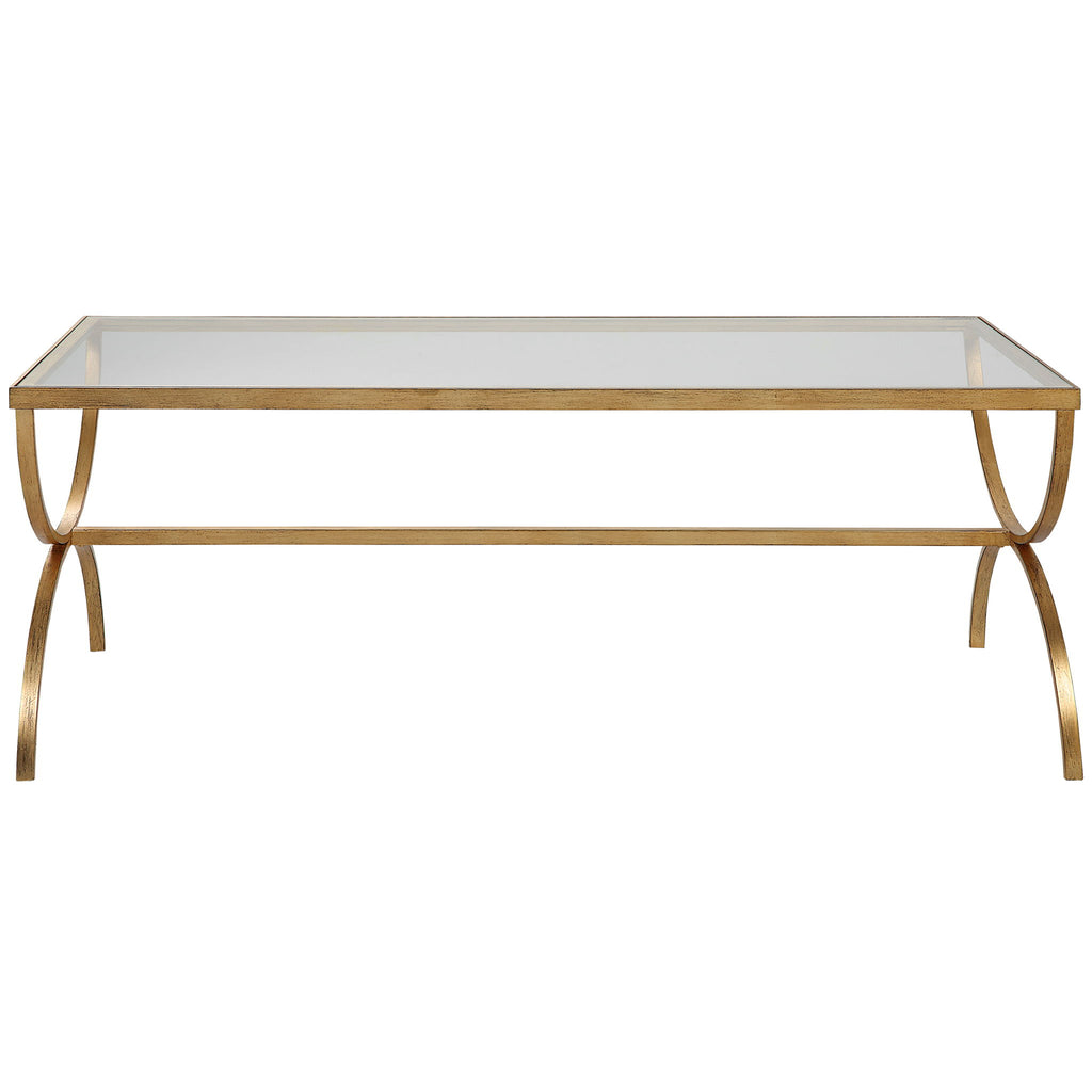 Traditionally Inspired, This Coffee Table Showcases Graceful Lines Constructed By Hand Forged Iron In An Antiqued Gold Finish With A Tempered Glass Top.