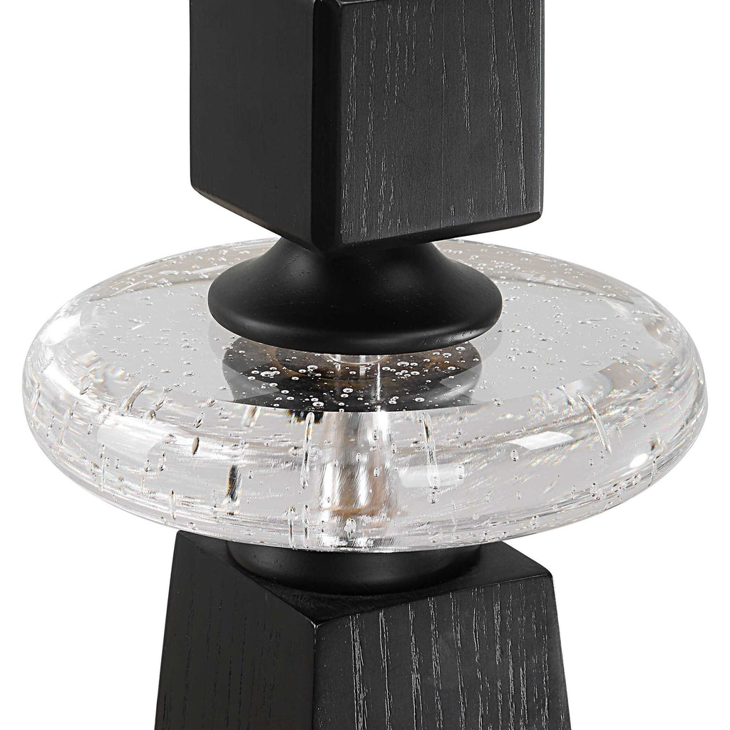 These Tall Floor Candleholders Combine Modern Elegance With Rustic Charm, Crafted From Stained Black Wood And Accented By A Distinctive Seeded Glass Ring. The Sleek, Tall Design Creates A Striking Visual Statement, Perfect For Illuminating Any Room With Warmth And Ambiance. Two 4x3 White Candles Included. Sizes: S-7x30x7, L-7x36x7