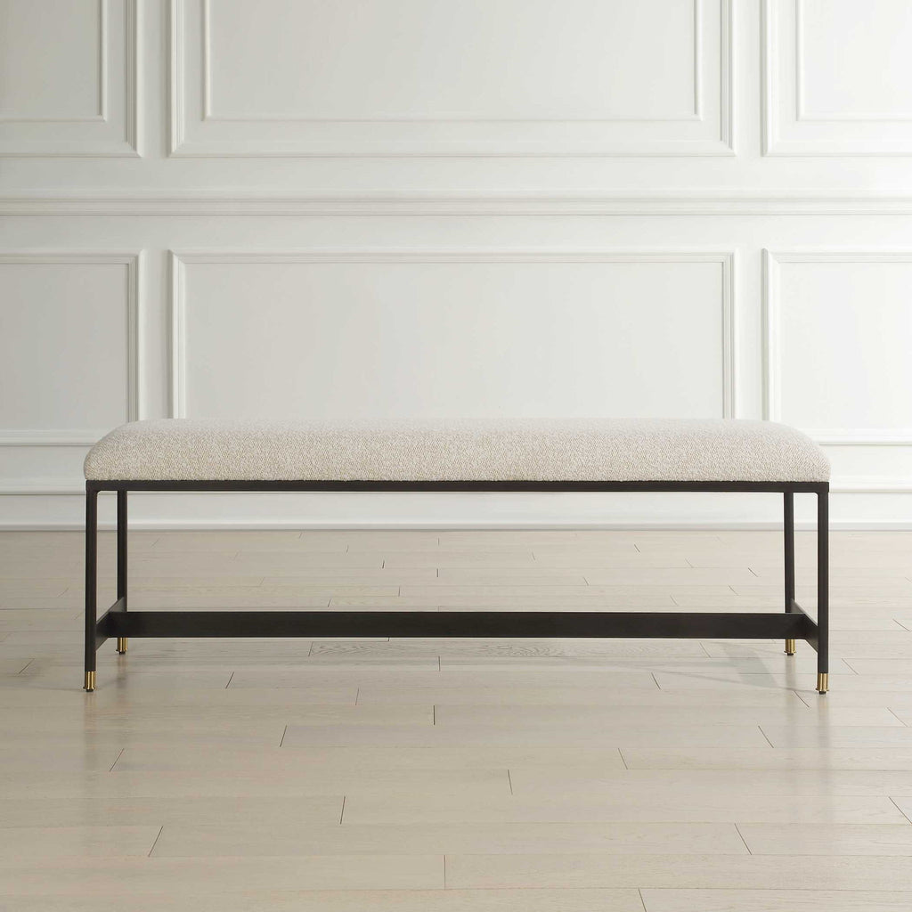 This Bench Features A Sleek Matte Black Iron Frame And Is Paired With A Plush Upholstered Seat In A Casual Off-white Polyester Blend With Wool-like Texture, Accented With Petite Brushed Brass Feet Caps.