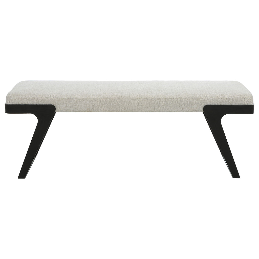 The Modern Hover Bench Is Streamlined With An Aged Black Curved Iron Base And Cushioned Seat. Upholstered In An Ivory Chenille Boucle Performance Fabric.
