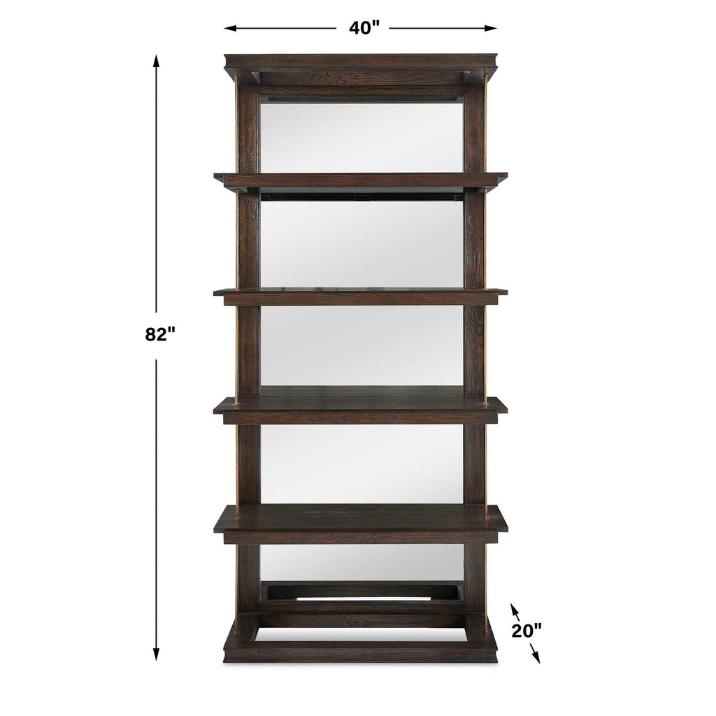This Elegant Etagere Combines A Classic Dark Walnut Finish With Gold Accents. Crafted From Oak, It Features Four Open Shelves For Displaying Your Favorite Items. The Mirrored Back Adds Depth And Light To Your Space, While The Gold Iron Bars Create A Striking Visual Contrast.
