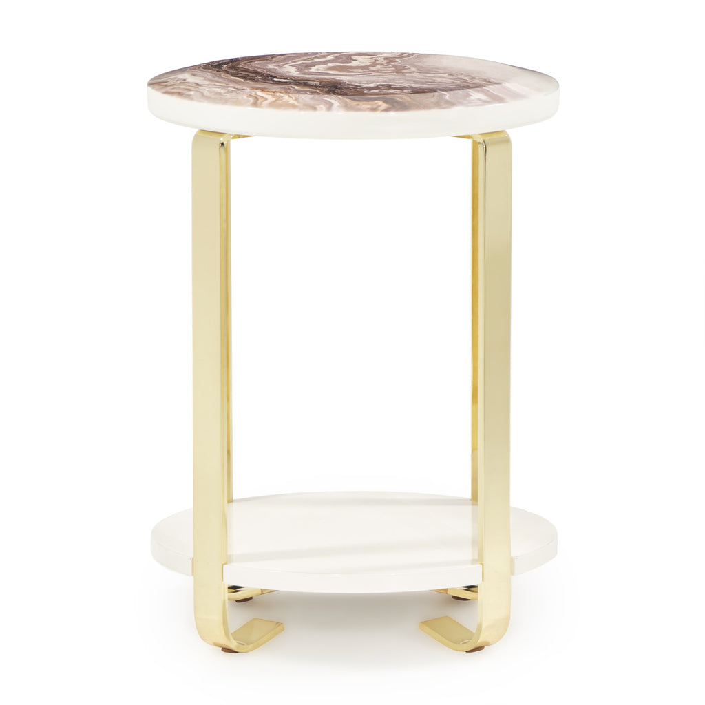 The Ariana Chair Side Table is a petite yet impactful addition to your luxurious decor. Its tall, slender golden legs and convenient bottom shelf combine to create a tasteful companion for your favorite chair.