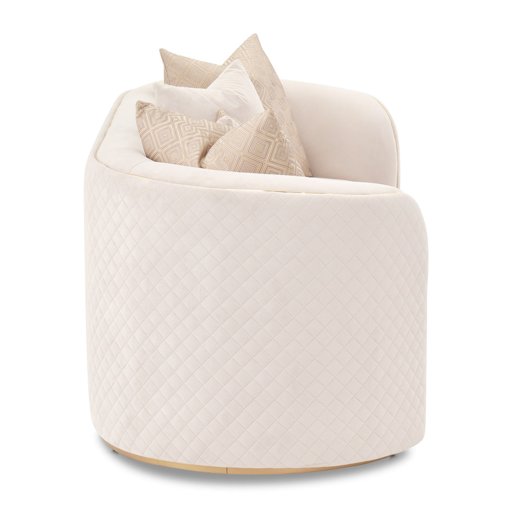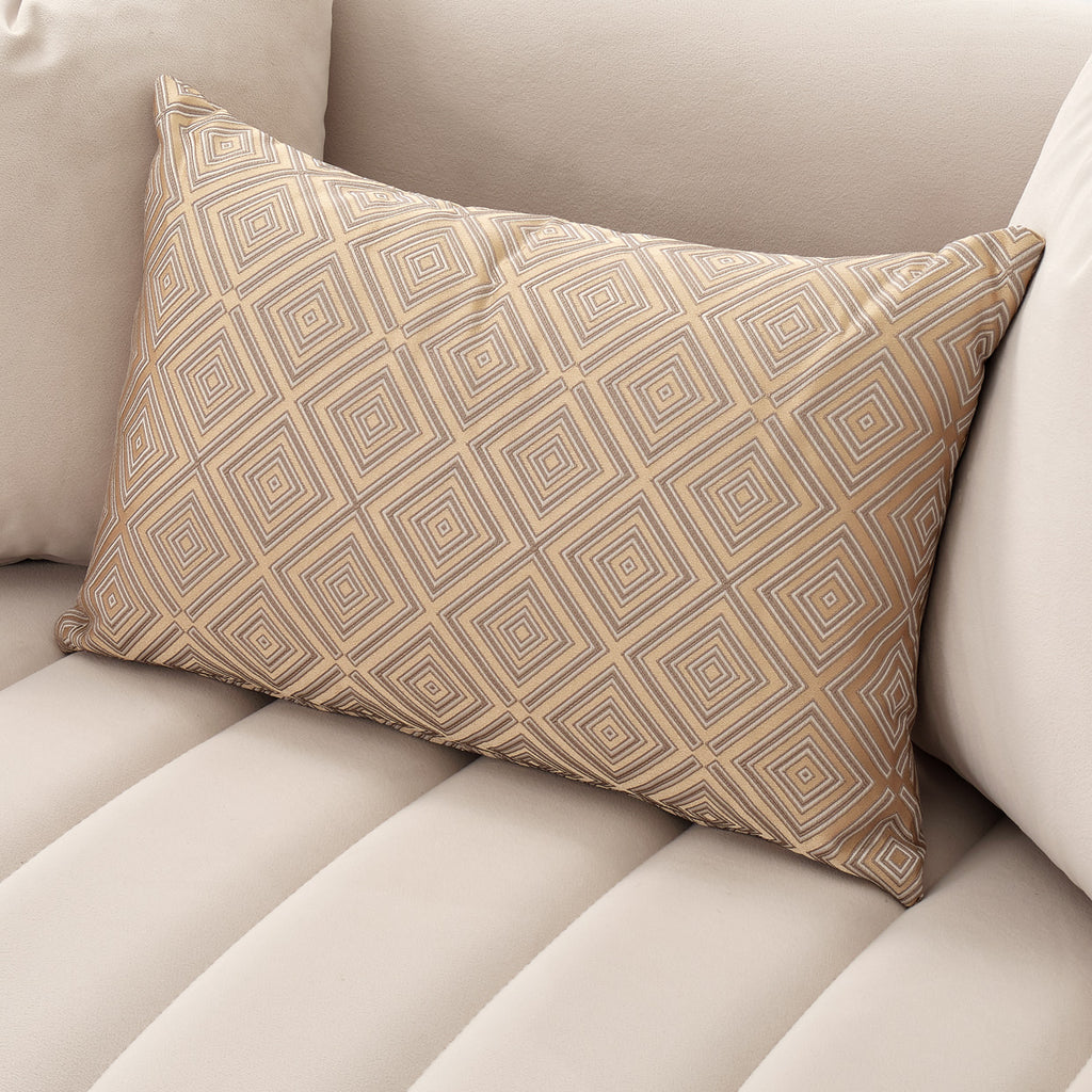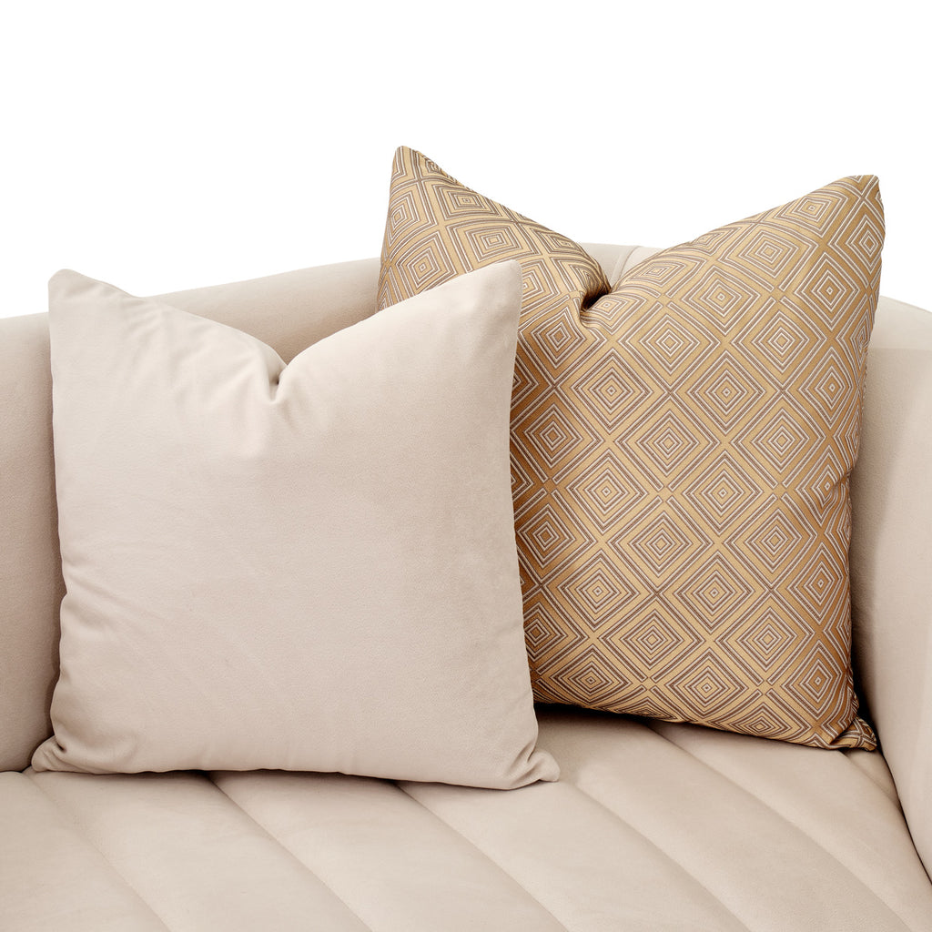 Discover intimate luxury with the Ariana loveseat. Furnished with five exquisite accent pillows - gold jacquard, velvety beige plushness, and an oblong centerpiece - it offers a more personal seating experience, perfect for quiet evenings or heartfelt conversations.