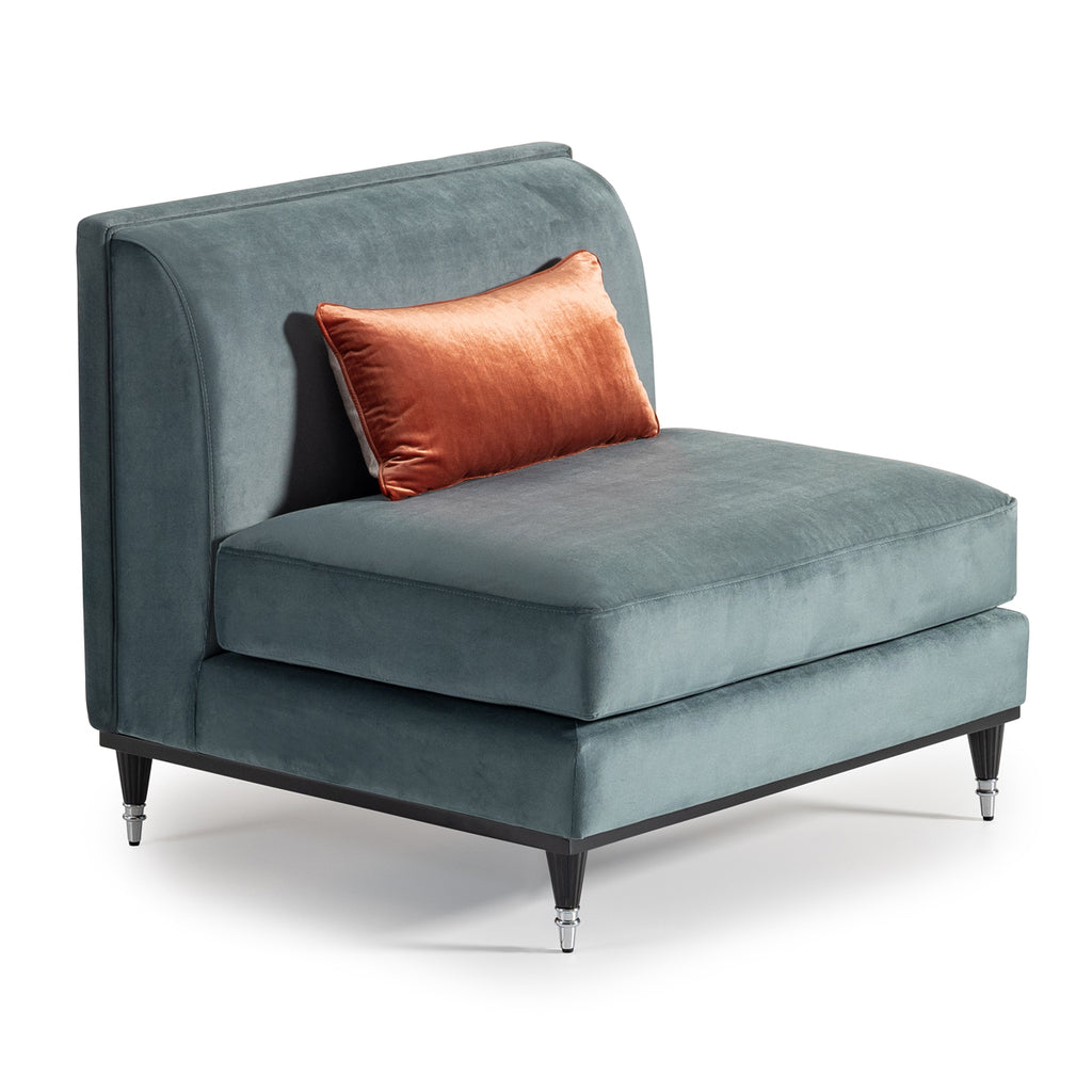 Dressed in sumptuous azure blue velvet, this chic piece is accentuated by a single sunset velvet oblong pillow, adding a dash of warmth to its sophisticated charm. Whether you choose to create a larger seating area by pairing it with additional armless chairs or let it shine as a stand-alone statement piece in any room, this elegant chair offers boundless possibilities to elevate your space.