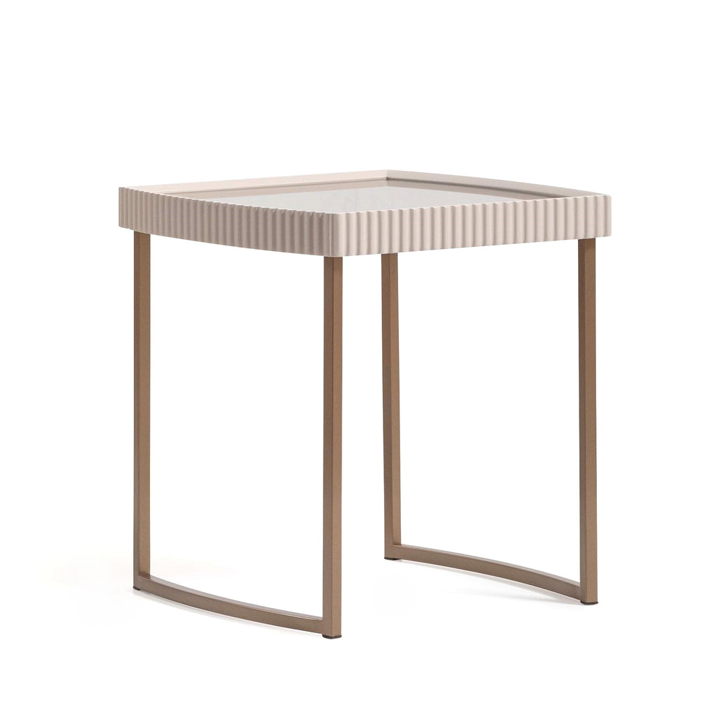 Refined elegance takes shape in the Lisbon End Table, where architectural lines meet sumptuous softness. Cloaked in a silky cream finish, the curved form is sculpted with vertical reeding that adds dimension and designer appeal. A subtly tinted mirrored top captures the light with understated brilliance, while the matte bronze base provides a warm, grounded contrast. Petite in scale but grand in presence, this table elevates any room with its poised silhouette and serene glamour.