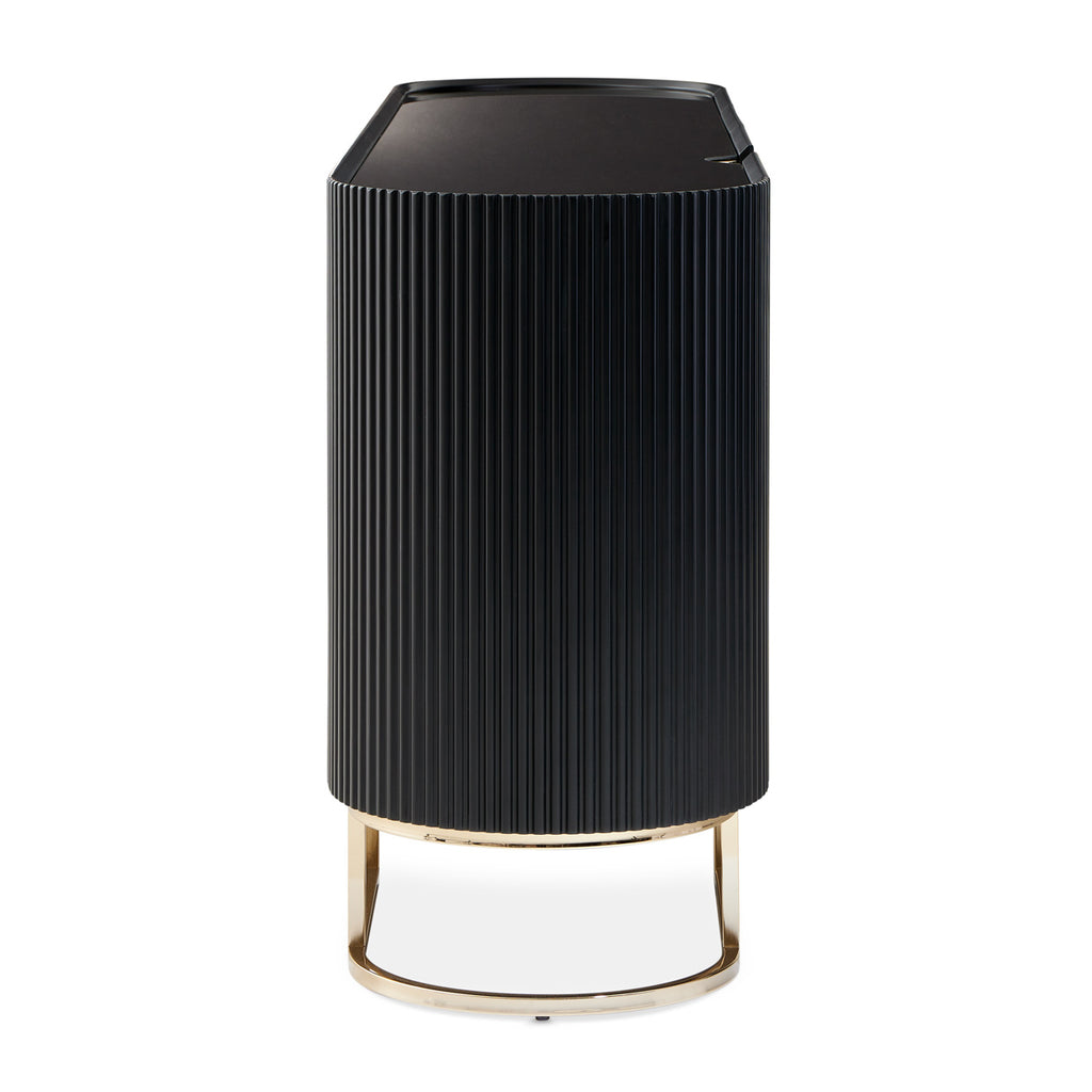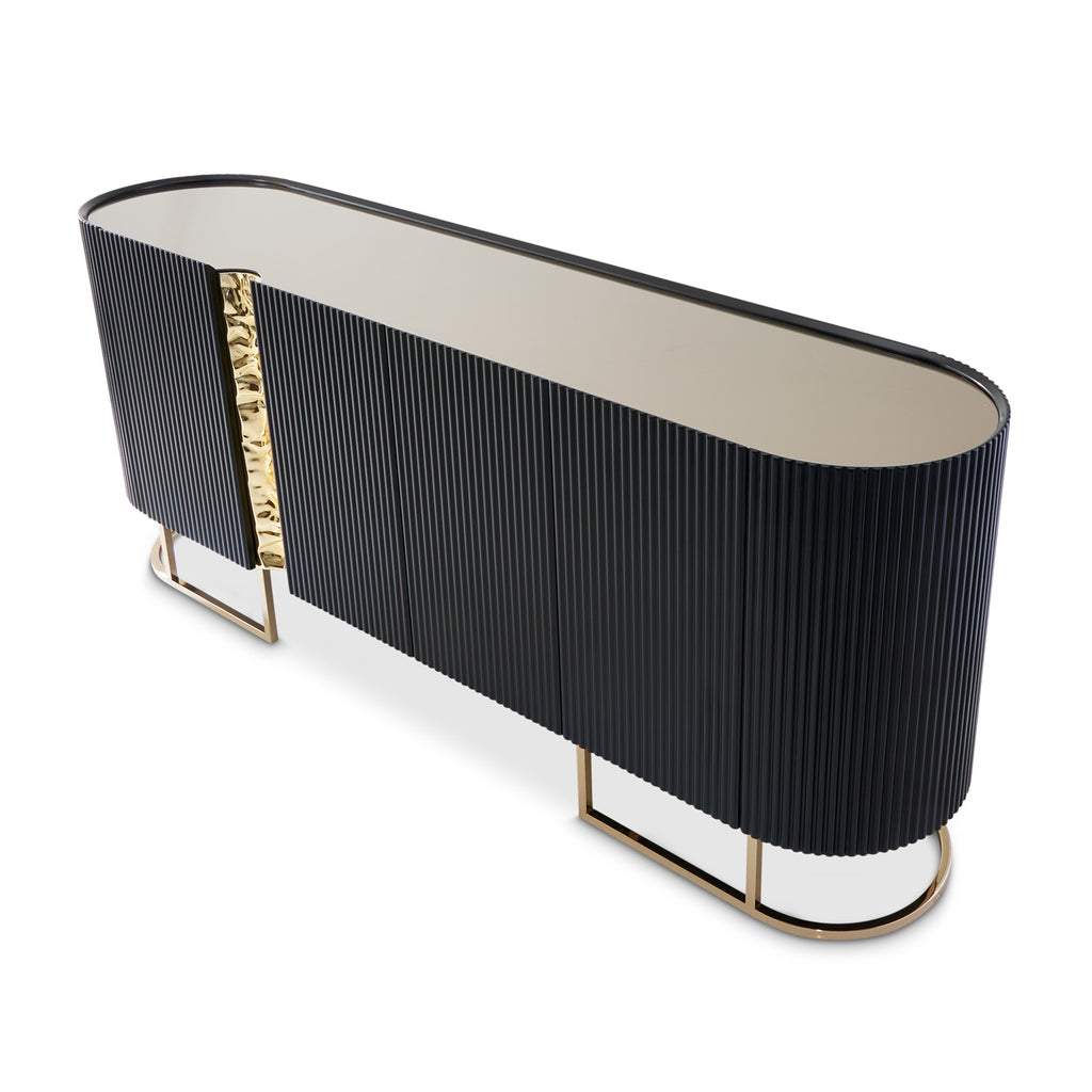 Refined elegance meets striking contrast in the Lisbon Console Cabinet. A curved matte black silhouette is accentuated by ribbed detailing and a gleaming gold enclave, creating a statement piece that commands attention. The tinted mirrored top enhances the luxe aesthetic, while six spacious shelves and a discreet drawer provide versatile storage for any setting.