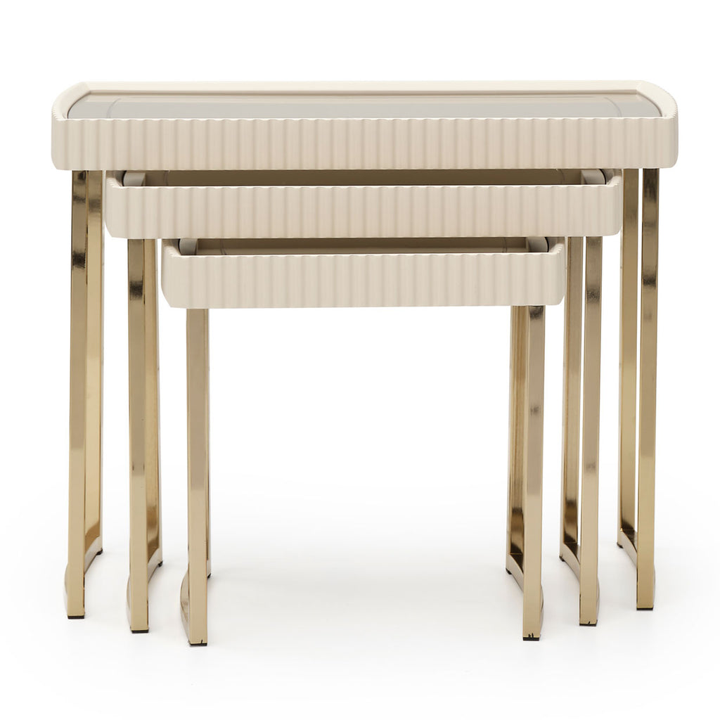 Contemporary brass legs support a top featuring a ribbed textured detail on the sides in a taupe color, adding a sense of sophistication and style to any space. Designed to nest as a full sized coffee table, these three tables have the ability to completely separate, creating three versatile pieces to use throughout the living room. A simple addition to your sofa or side chair.