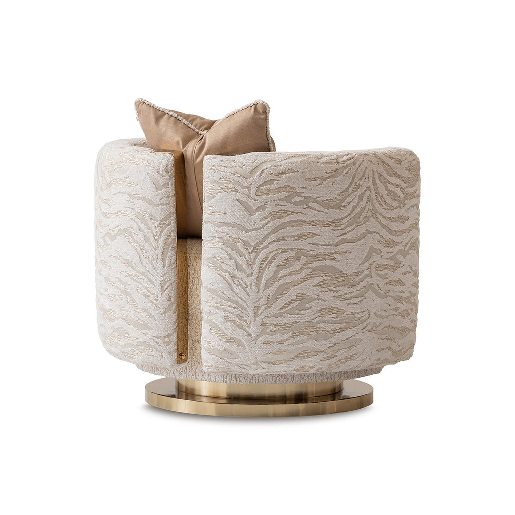 Wrap yourself in the striking elegance of the Savannah Breeze Swivel Chair. Enveloped in a bold animal-patterned jacquard chenille, this chair combines artistry with plush comfort, inviting you to relax in style. The 360-degree swivel base, crafted in polished gold, and a sophisticated gold-accented cutout on the back add a touch of glamour, ensuring every angle captures attention.