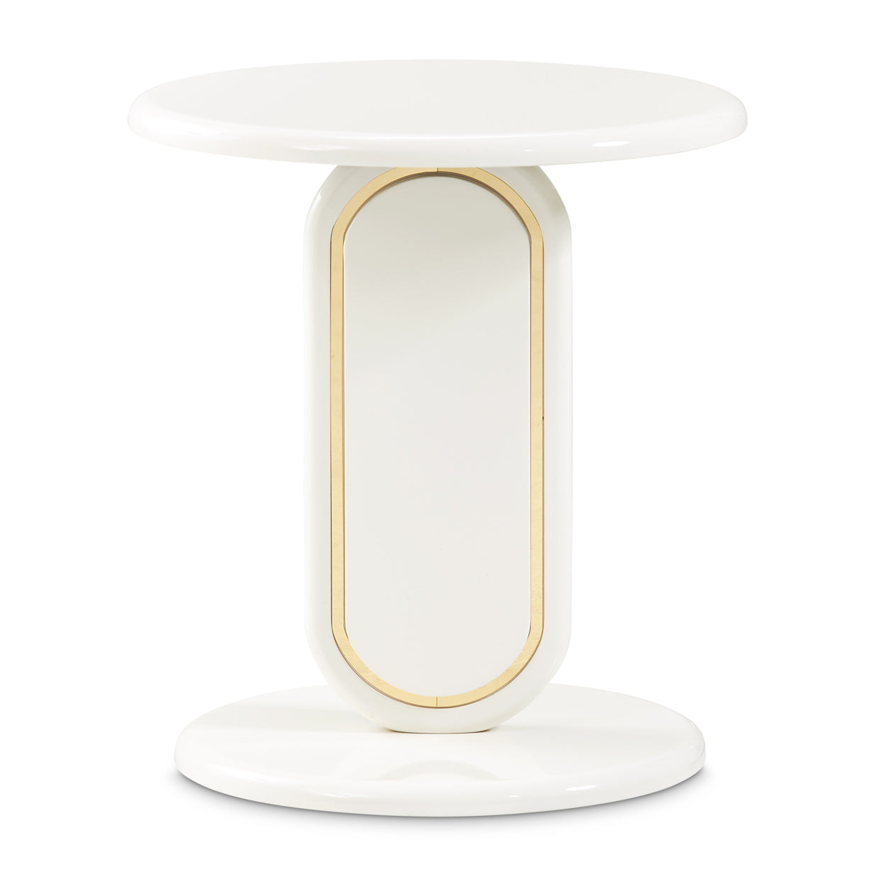 The Sassani Accent Table combines a pearl white lacquer finish with bold gold accents for a sleek and modern look. Its minimalist design and compact form make it a versatile piece that adds a touch of luxury to any space, whether used as a functional accent or decorative element.