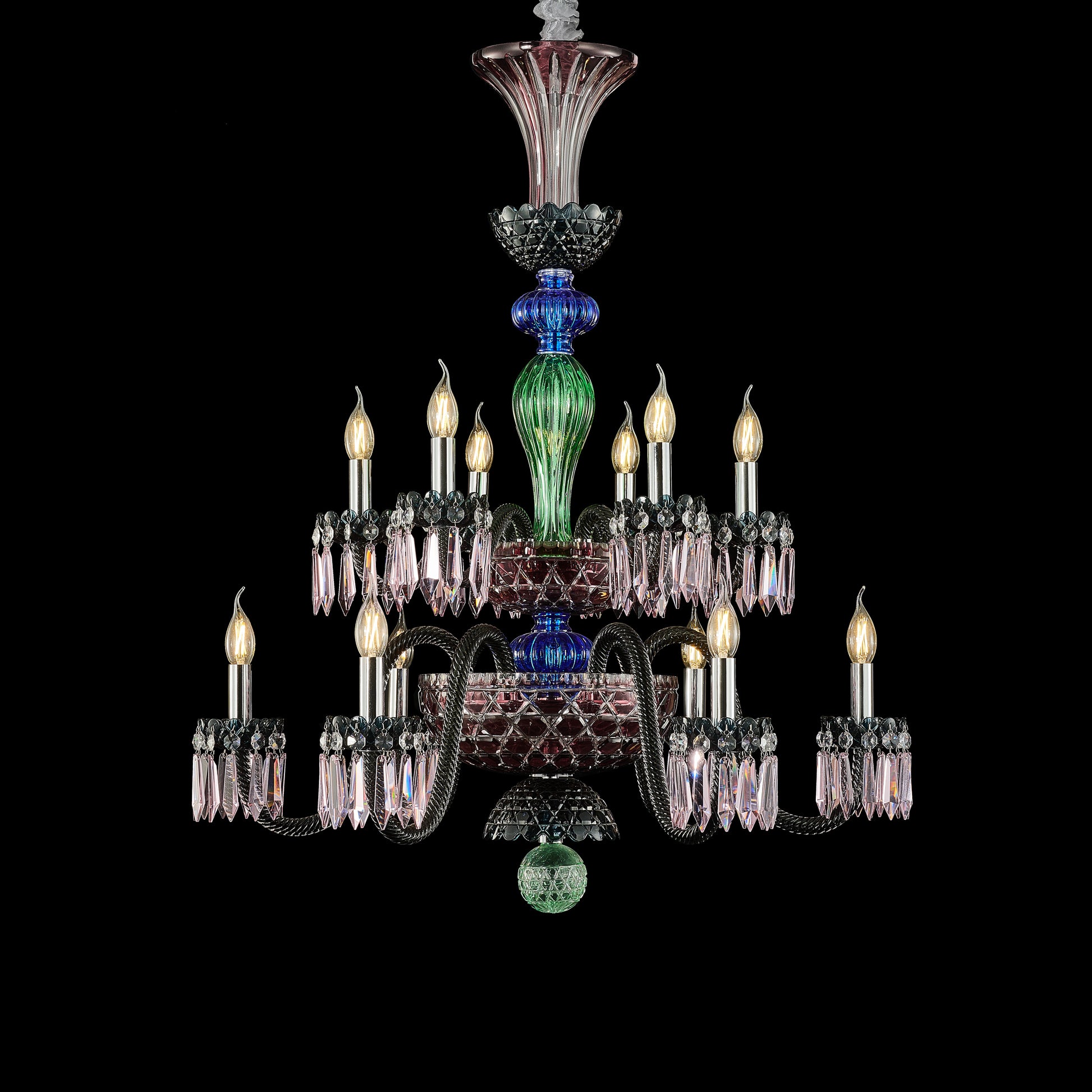 An ode to dramatic artistry and haute design, the Noir 12-Light Chandelier evokes the splendor of a Venetian masquerade—mysterious, bold, and utterly captivating. Exquisite scroll arms in a braided noir finish unfurl with sculptural grace, suspending from a multi-tiered frame adorned in amethyst-hued crystal spears. At the heart of this masterpiece, the central column gleams in sumptuous jewel tones—deep emerald, royal sapphire, and garnet—each glass element hand-shaped to evoke the richness of antique heirlooms. A faceted crystal orb floats beneath the base like a final whispered secret of luxury, catching the light and dazzling from every angle.