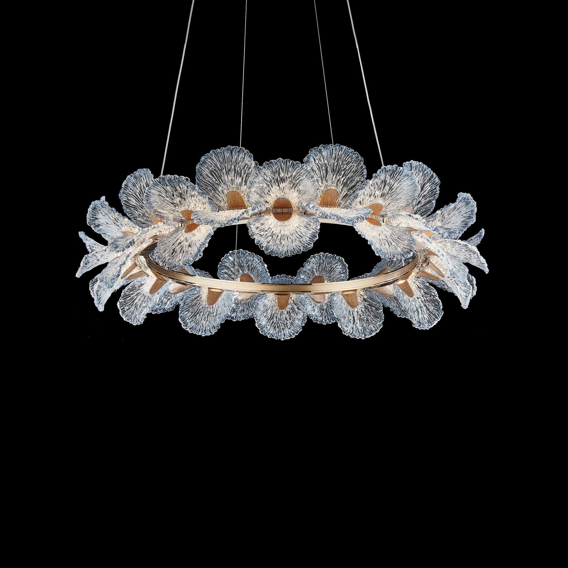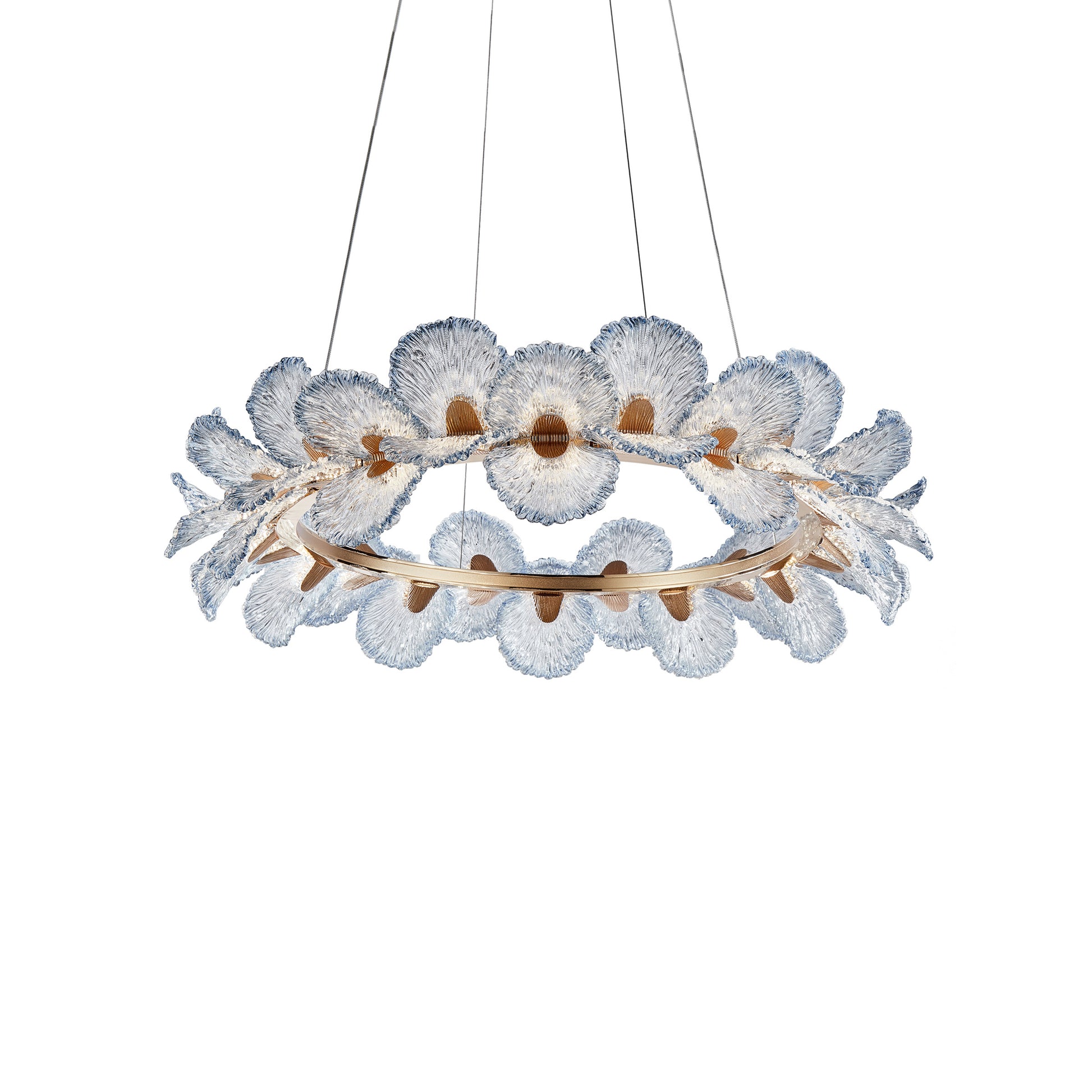 An ethereal vision brought to life, the Brisa Grand Chandelier evokes the serene poetry of wind and sea. Named for the gentle breeze it resembles, this sculptural masterpiece floats effortlessly in space—its flowing form crafted from hand-sculpted acrylic petals with soft, undulating edges and a luminous wash of oceanic blue at the tips. A halo of warm champagne-bronze anchors the design, encircling the arrangement like a glistening crown. With hidden LED lighting and weightless suspension, Brisa radiates both tranquility and grandeur—transforming your home into a gallery of modern elegance.