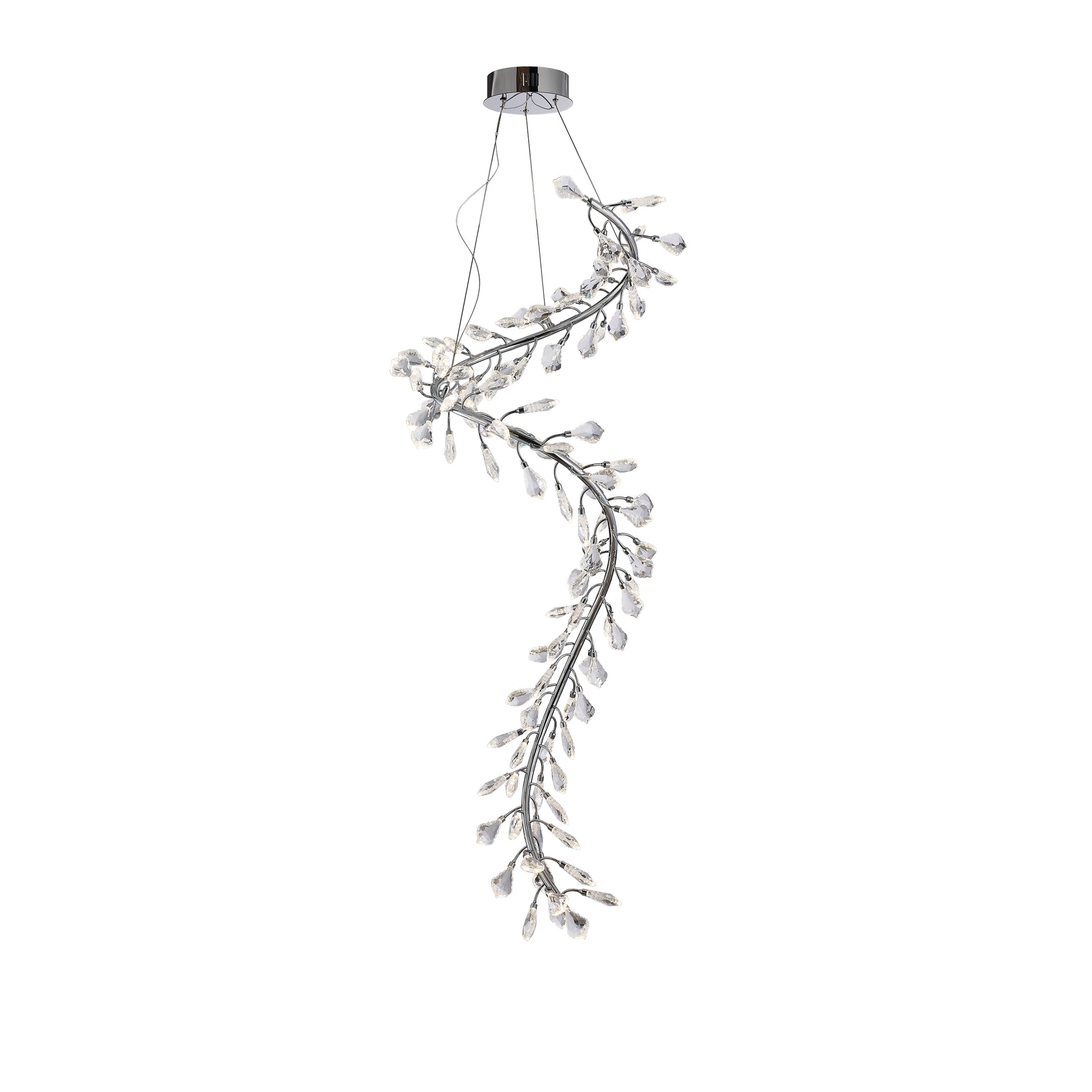A breathtaking embodiment of elegance in motion, the Zephira LED Chandelier evokes the effortless grace of a breeze captured mid-flight. Its sinuous, spiraling form is adorned with cascades of precision-cut crystal pendalogues, each delicately poised along a gleaming chrome frame. Suspended by nearly invisible cables, the chandelier appears to float weightlessly, exuding a celestial presence that radiates refinement. As integrated LED lights illuminate each crystal, the fixture transforms into a luminous sculpture—shimmering with quiet opulence and timeless allure. Zephira is not merely a chandelier; it is an artistic statement of serene luxury.